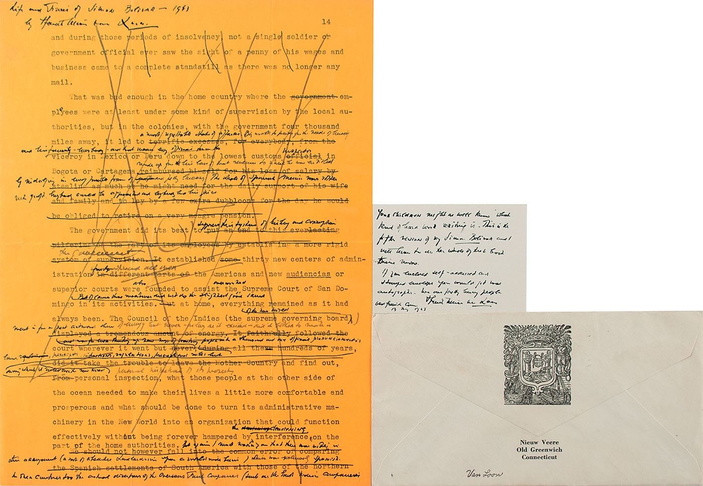 Two items: a heavily hand-corrected typed manuscript page signed and titled at the top, "Life and Times of Simon Bolivar—1953, by Hendrik Willem van Loon," one page, 8.5 x 11, with the entire text struck through; and an ALS on an off-white 3.5 x 2.5 card, May 13, 1943, in part: "Your children might as well know what kind of hard work writing is. This is the fifth version of my Simon Bolivar and I will have to do the whole of that book twice more." In overall fine condition. Accompanied by the original mailing envelope, addressed in van Loon's hand.