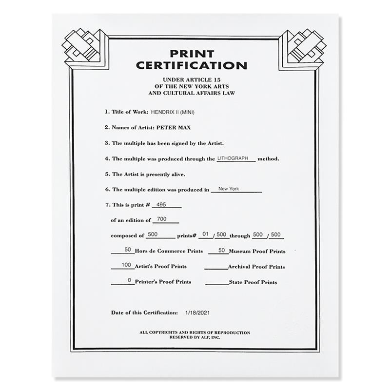 "Hendrix II" is a limited edition lithograph on paper by Peter Max, numbered 495/500 and hand signed by the artist. This piece comes framed and includes Certificate of Authenticity from Peter Max Studios. Measures approximately 20" x 19 (frame), 4" x 2.5" (image).