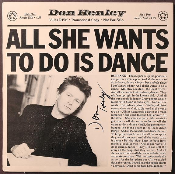 Henley, Don - Album Cover Signed. Promotional copy of the single, "All She Wants To Do Is Dance" signed by Henley on the cover with a felt-tip pen. The album is present; each side has a remix edit of the song that went to #9 and that appeared on Henley's 1984 album, "Building the Perfect Beast." Henley was a founding member of the Eagles (1971-80), one of the most successful rock groups of all time, before launching his solo career.