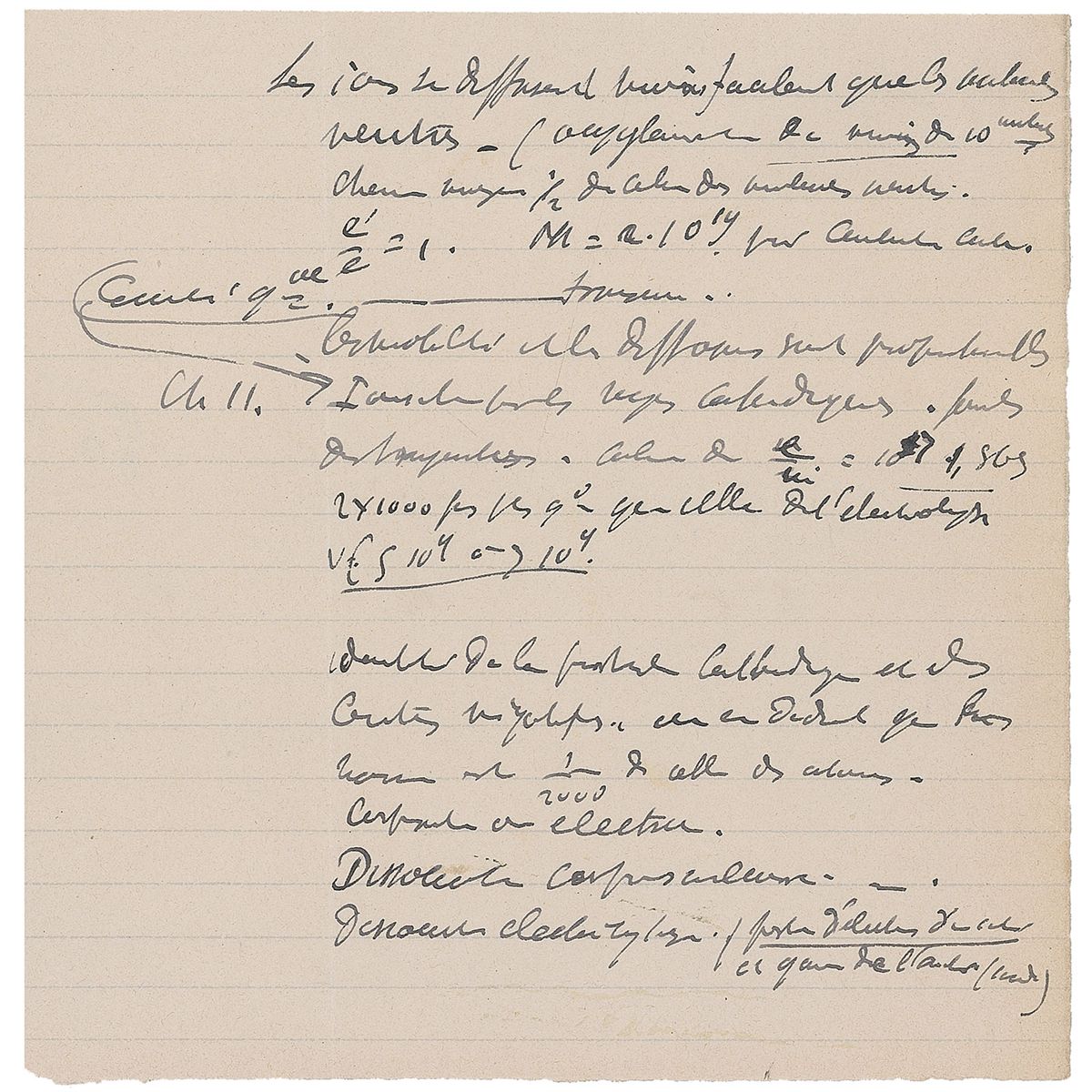 Physicist (1852–1908) whose experiments with uranium salts led to the discovery of spontaneous radioactivity; for this breakthrough he shared the 1903 Nobel Prize for Physics with the Marie and Pierre Curie. Autograph research notes, one page, lightly-lined, 8.75 x 6.25, no date. Becquerel writes scientific notes about ions, electrolysis, atoms, molecules, positive charges of the ions and reactions, as well as several long formulas. In fine condition.