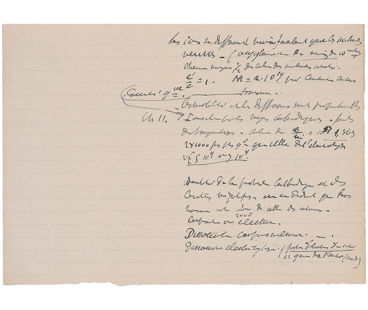 French physicist (1852–1908) whose experiments with uranium salts led to the discovery of spontaneous radioactivity; for this breakthrough he shared the 1903 Nobel Prize for Physics with Marie and Pierre Curie. Desirable unsigned handwritten scientific research notes, one page, 8.75 x 6.25, no date. Becquerel pens research notes about ions, electrolysis, atoms, molecules, and positive charges of the ions and how they react, including several formulas, such as: “e/e=l,” and “n=r10 to the power of 19.” He then explains how “e/u = 10 to the power of 7, 2x 1000…of the electrolysis v( S 10 to the power of 4 ), l/2000 of the atom dissolving middle body.” In fine condition. Manuscripts by Becquerel discussing his work on radioactivity are of great rarity.