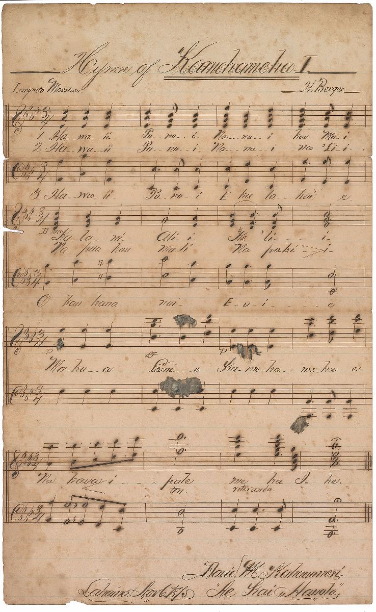 German composer and bandmaster (1844–1929) sent to Hawaii to conduct the king’s band. Enamored with the land and people, he became a naturalized citizen and took it upon himself to record traditional Hawaiian hymns, chants, and other music in print to ensure their survival. Autograph musical manuscript, titled and signed at the top, “Hymn of Kamehameha I, H. Berger,” one page, 7.75 x 12.5, November 6, 1875. Berger pens the song in four two-line systems containing a total of 32 bars of music and lyrics. The lyrics were originally developed by King David Kalakaua, who Berger credits at the bottom as “David M. Kahanonesi, Re Kai Hanola.” Fragile, with moderate overall foxing and toning, and partial separations to horizontal folds, otherwise very good condition. This piece, better known as ‘Hawai'i Pono'i,’ became the Hawaiian National Anthem and today remains the state anthem.