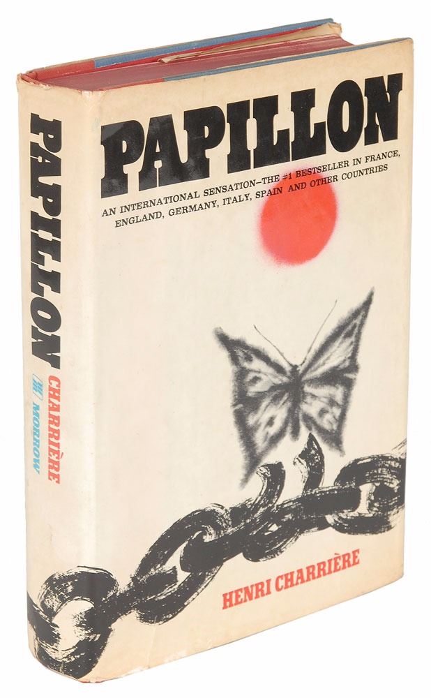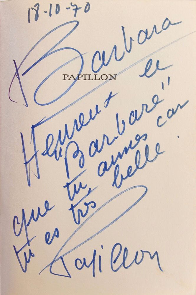 Convicted murderer and author of Papillon (1906–1973), an account of his time in a penal colony in French Guiana, later turned into a film starring Steve McQueen. Signed book: Papillon. First English edition. NY: William Morrow and Company, 1970. Hardcover with dust jacket, 6.5 x 9.5, 434 pages. Signed and inscribed on the half-title page in blue felt tip in French by Charriere, "Barbara...tu es tres belle. Papillon," with a date of October 18, 1970. In fine condition, with small edge tears and toning to dust jacket.