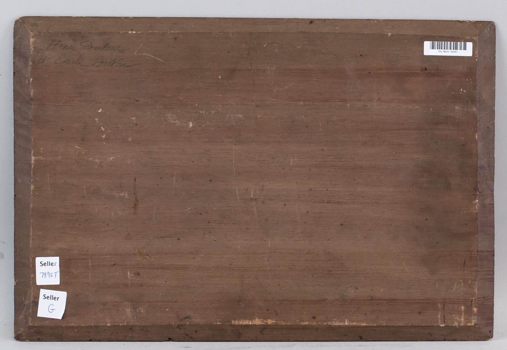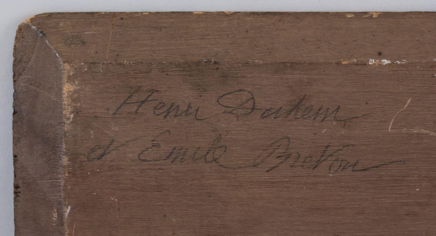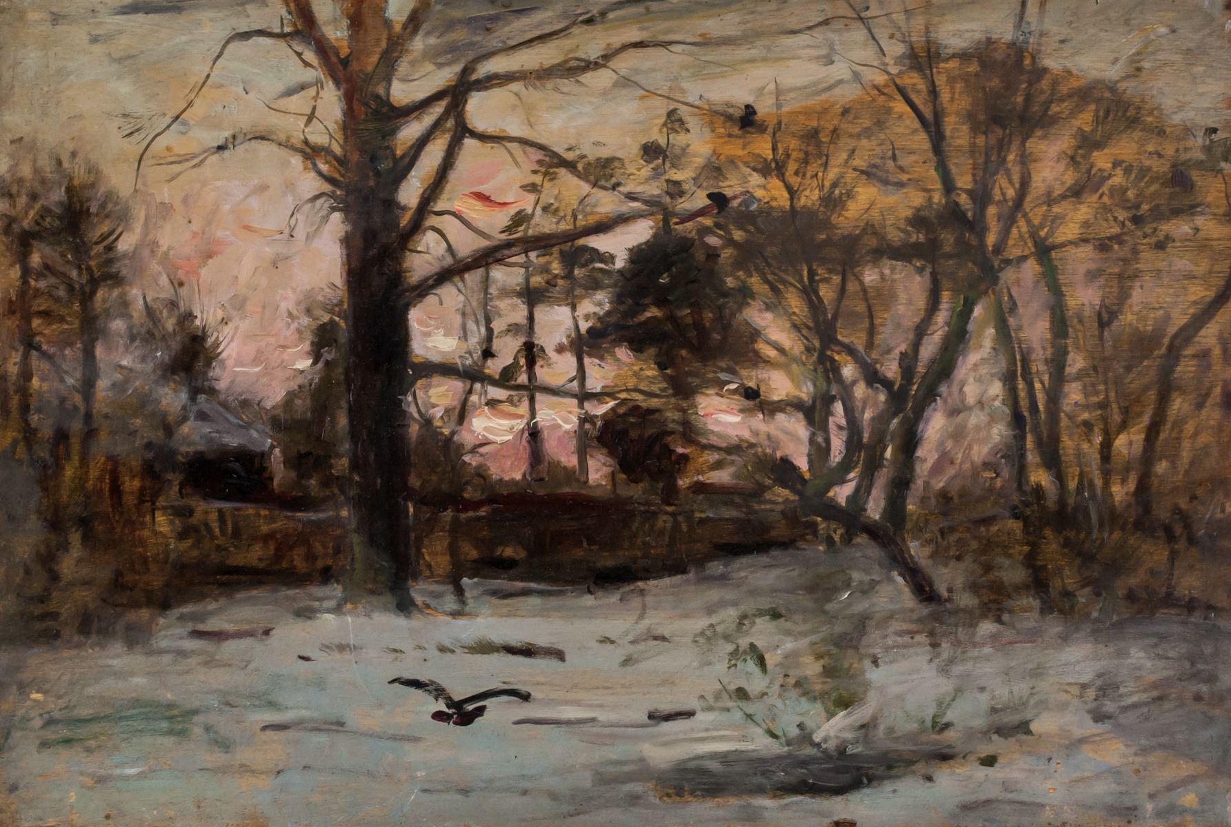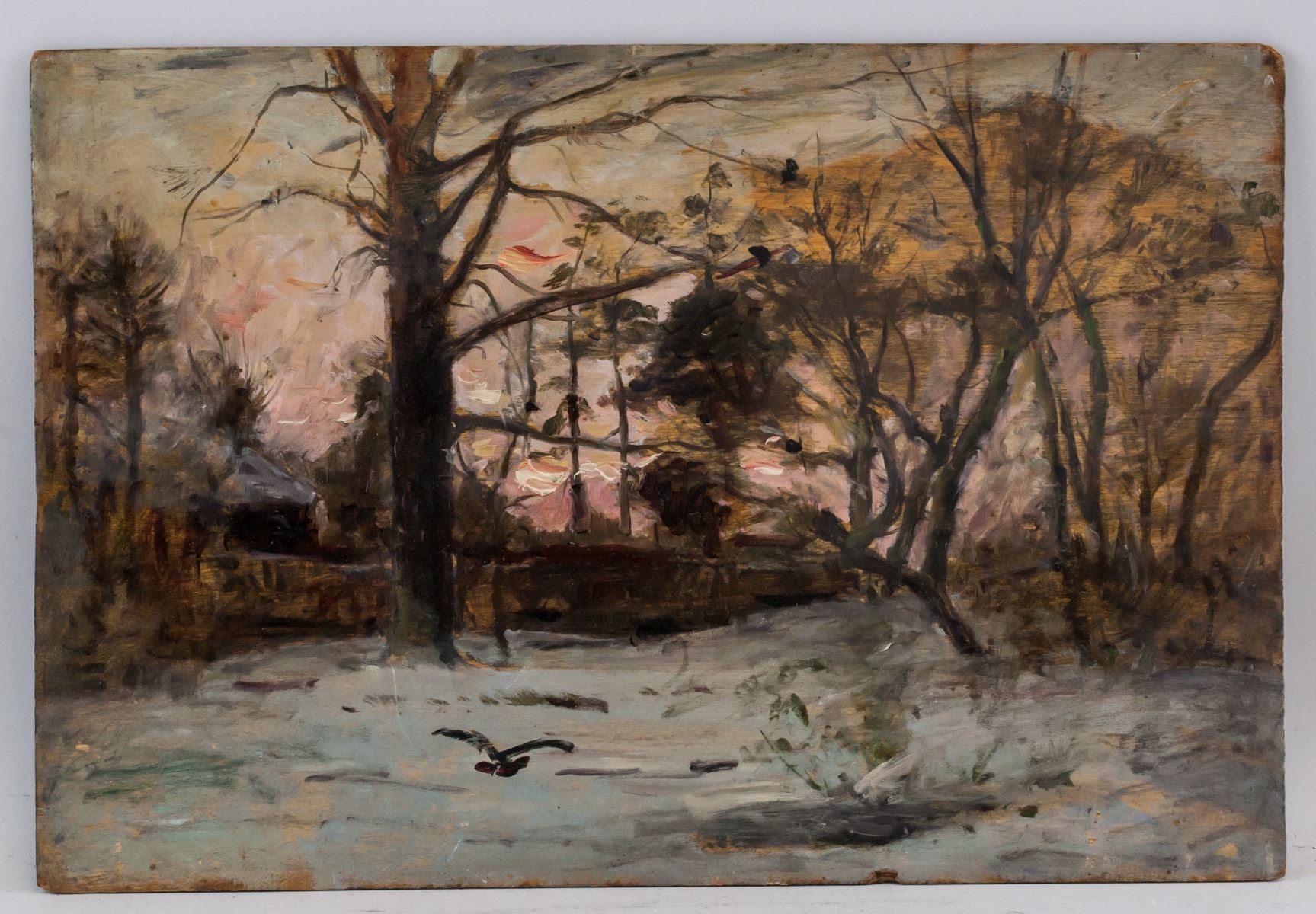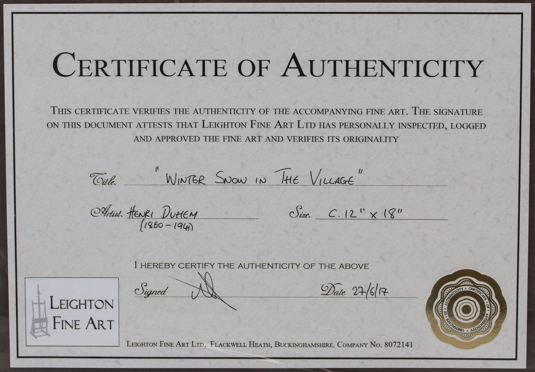 Oil on board. Featuring an impressionist winter landscape scene. Unsigned. Entitled, "Winter Snow in The Village". Attributed to Henri Duhem (1860-1941, French). Accompanied with a certificate of authenticity, Leighton Fine Art. 29 x 44 cm (12 x 18 inches. PROVENANCE: Private American collection
