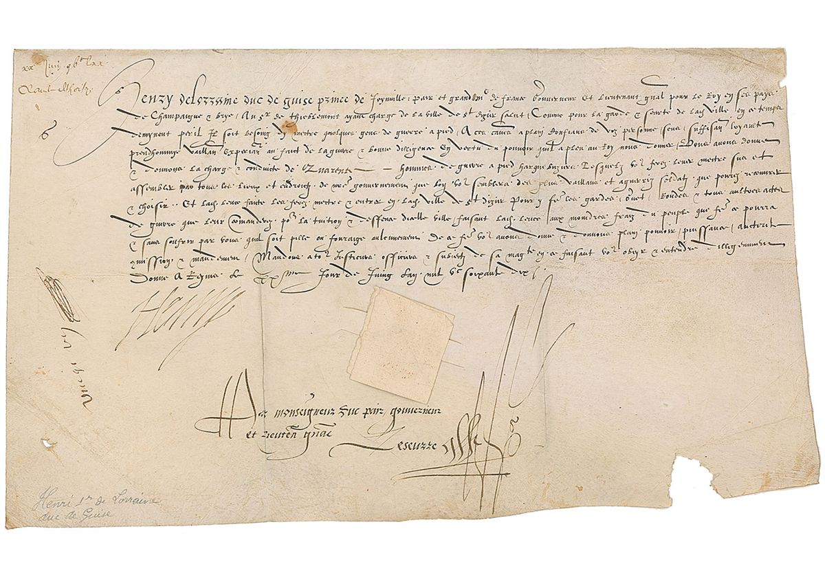 Valiant nobleman (1550–1588) who became known as Le Balafre (Scarface) after being wounded at the Battle of Dormans in 1575. With a charismatic and brilliant public reputation, he rose to heroic stature among the Catholic population as an opponent of the Huguenots, founding the Catholic League in 1576 to prevent Henry of Navarre from taking the throne. A powerful opponent of Catherine de Medici, he was assassinated by the bodyguards of her son, King Henry III. Untranslated vellum manuscript DS in French, signed “Henry,” one page, 13.5 x 8, June 22, 1561. The document retains its original paper seal inserted through a cut in the center, though most of the red wax seal has cracked and worn away. Intersecting folds, a few small stains, light creases, and unobtrusive paper loss to the bottom, otherwise fine condition. Accompanied by an engraved portrait.