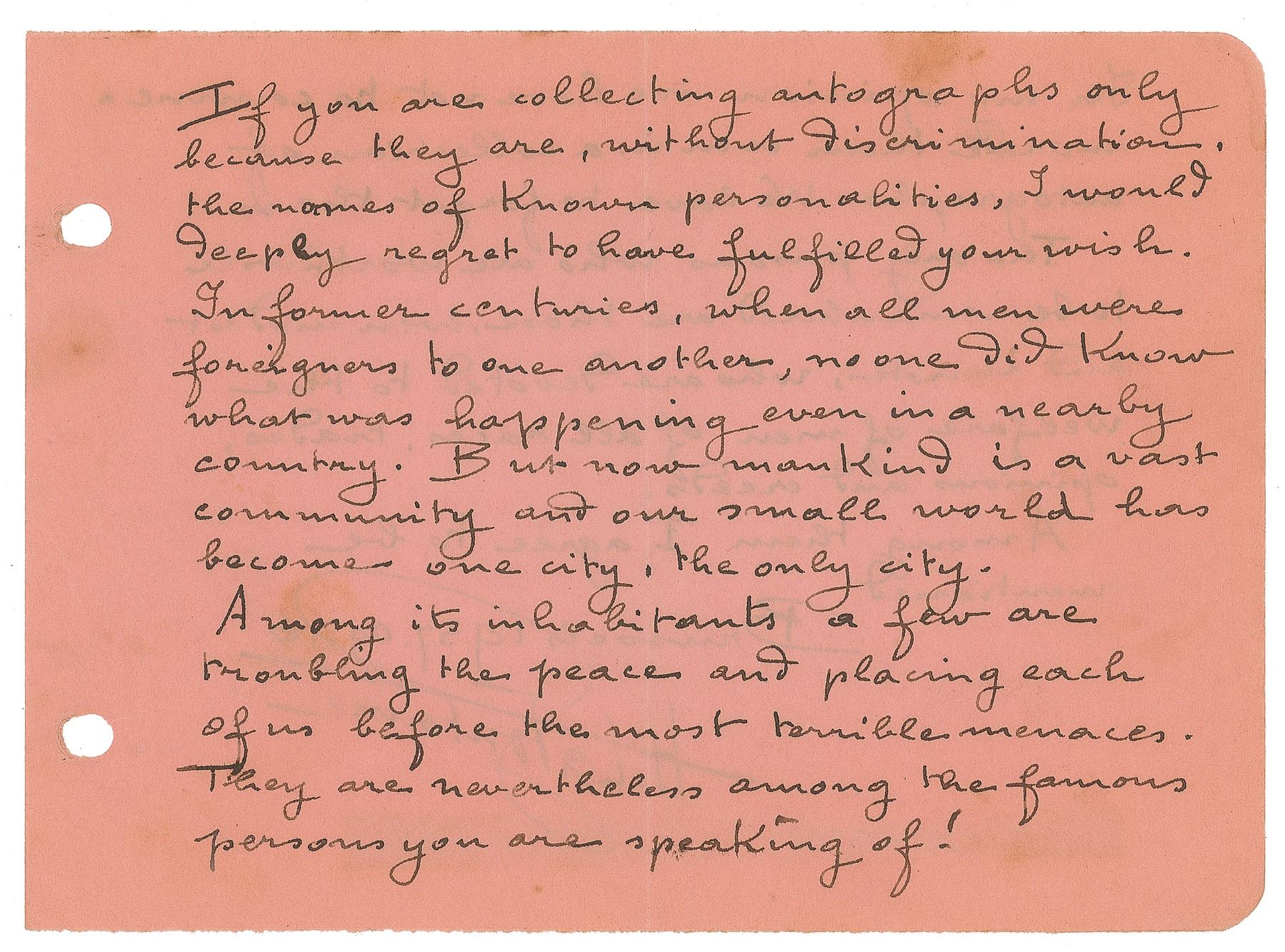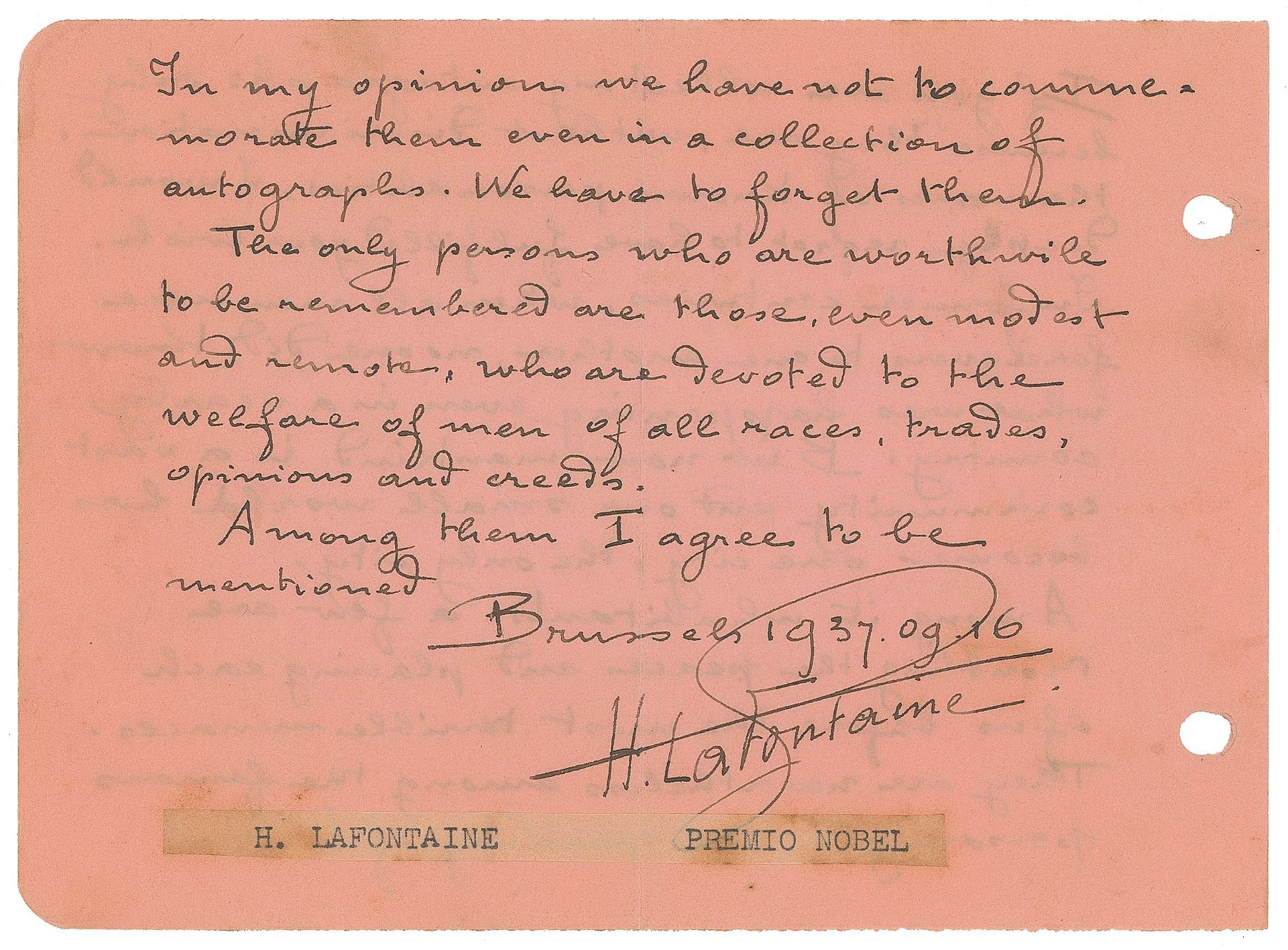 Interesting ALS, signed “H. La Fontaine,” written from Brussels and penned on both sides of a peach-colored 6.75 x 4.75 album page, September 16, 1937. In full: “If you are collecting autographs only because they are, without discrimination, the names of known personalities, I would deeply regret to have fulfilled your wish. In former centuries, when all men were foreigners to one another, no one did know what was happening even in a nearby country. But now mankind is a vast community and our small world has become one city, the only city. Among its inhabitants a few are troubling the peace and placing each of us before the most terrible menaces. They are nevertheless among the famous persons you are speaking of! In my opinion we have not to commemorate them even in a collection of autographs. We have to forget them. The only persons who are worthwhile to be remembered are those, ever modest and remote, who are devoted to the welfare of men of all races, trades, opinions and creeds. Among them I agree to be mentioned.” In fine condition, with some staining and a central vertical fold.