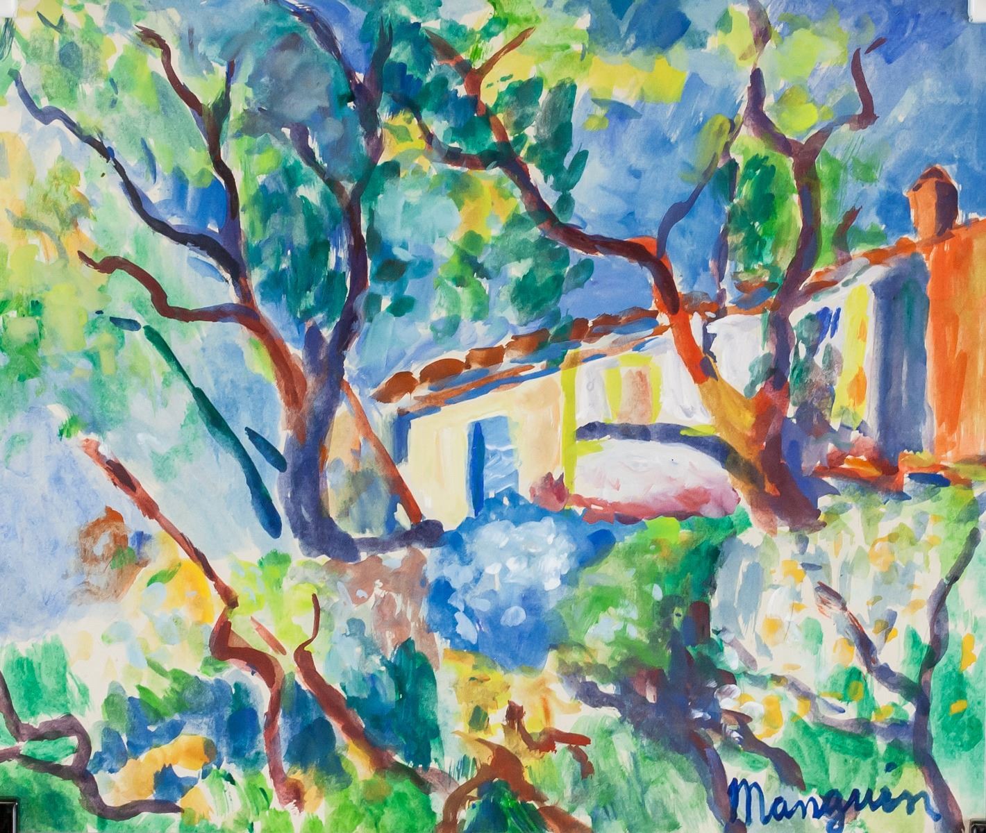 Tempera and watercolor on paper, unframed. Featuring house hidden among trees. Signed Manguin in bottom right corner. Inscribed with 617 on verso. Stamped illegibly on verso. Attributed to Henri Charles Manguin (1874-1949, French). 19.5 x 23.5 cm (7.75 x 9.25 in). PROVENANCE: Southern Ontario estate