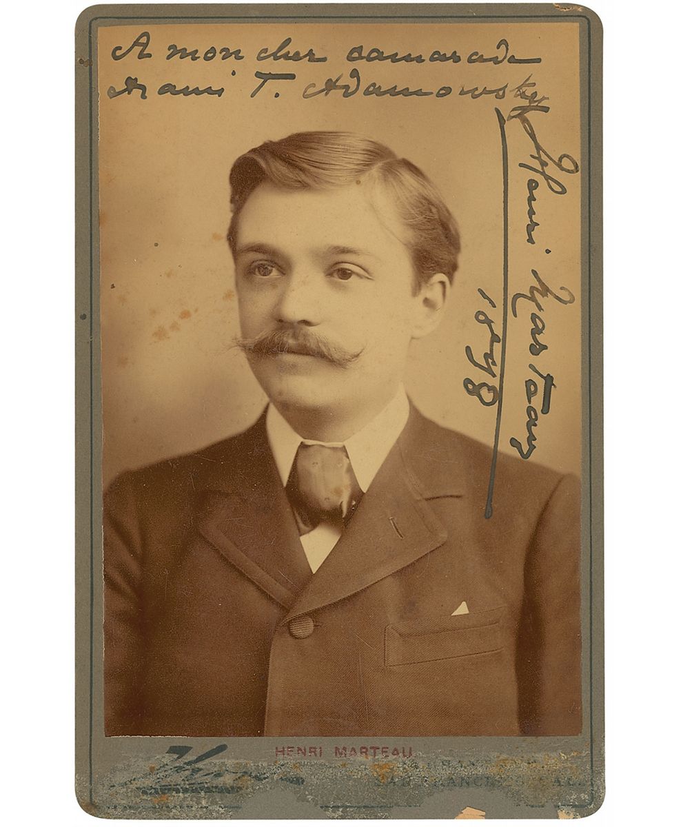 French violinist and composer (1874–1934). Original 4 x 6.5 cabinet photo, signed and inscribed in black ink in French and dated 1898. Some light surface loss and adhesive remnants to bottom border, a few edge dings, and some light foxing to image, otherwise fine condition.