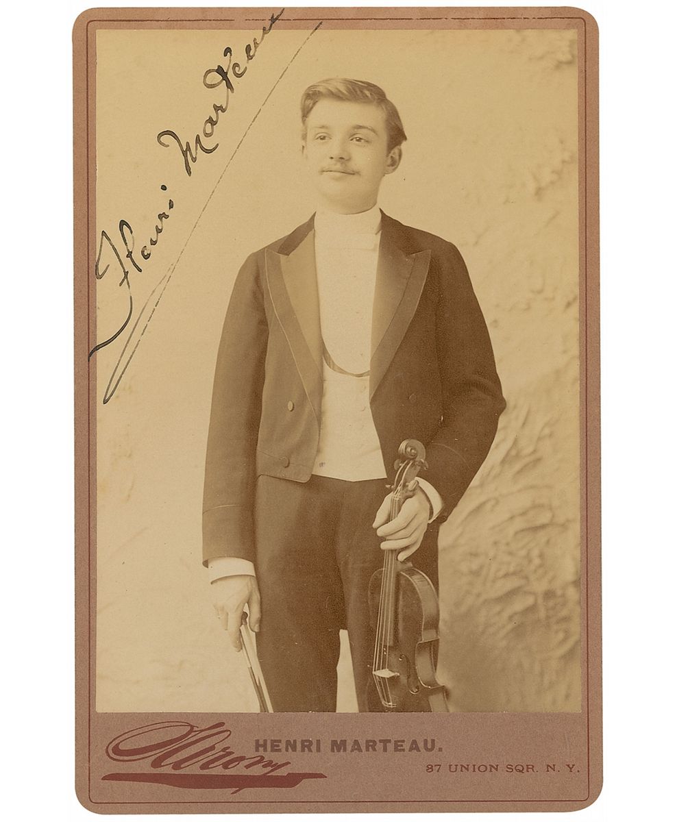 French violinist and composer (1874–1934). Original 4.25 x 6.5 cabinet photo of Marteau posing with his violin, by Sarony of New York, signed in black ink. In fine condition.