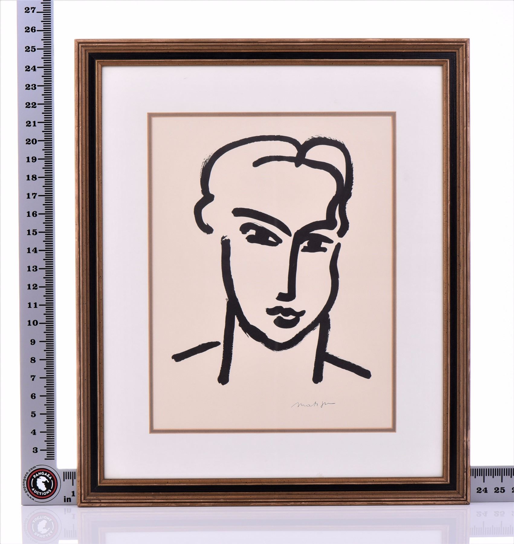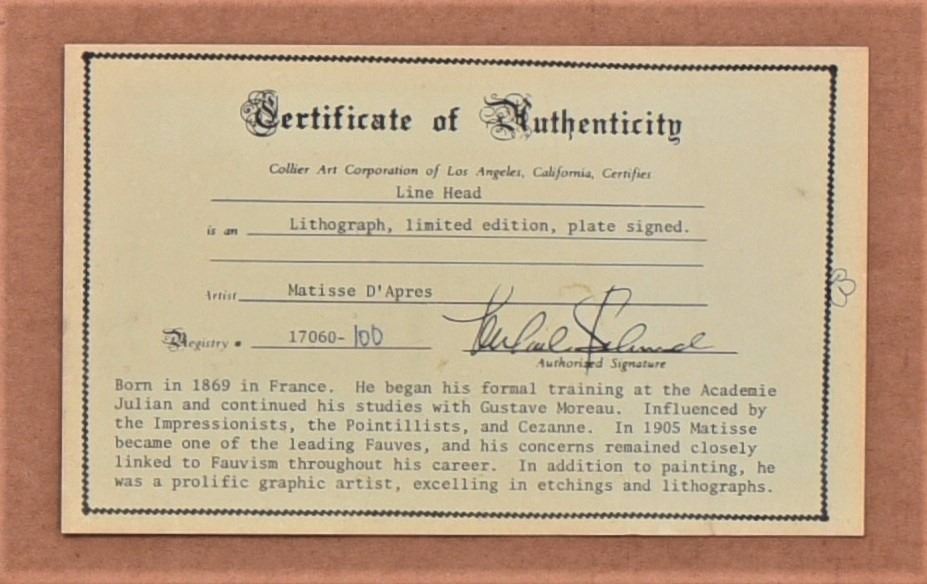 Henri Matisse (1869 – 1954) Lithograph titled "Grand Tete De Katina" Image size approximately13" x 19" original frame and Certificate of Authenticity from Collier Art Corp. LA, Ca. This very high quality limited edition lithograph rarely comes up for auction. Estimated more than 75 yrs. old. Fine Art. Size and/or Weight: See Measurement Photo. (Photos Represent The Lot Condition, Pangaea Auctions)