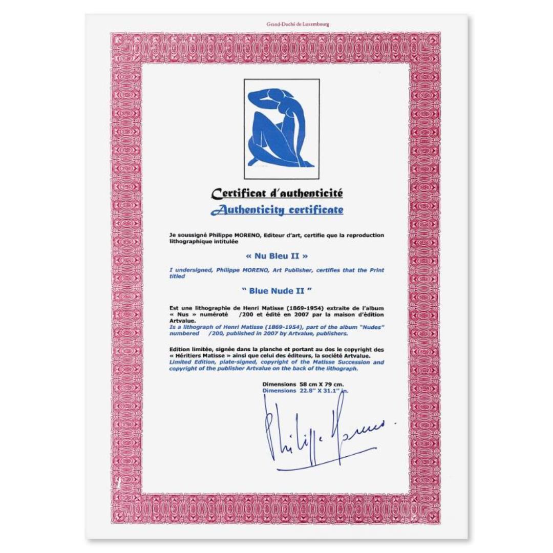 "Nu Bleu II" is a limited edition lithograph by Henri Matisse (1869-1954) bearing the plate signature of the artist. This piece comes from an edition of 200 authorized by the Matisse Estate; the edition number is not on the piece itself but on the certificate. This piece comes custom framed. Includes Certificate of Authenticity. Measures approx. 28.5" x 37" (frame), 22.5" x 31" (image).
