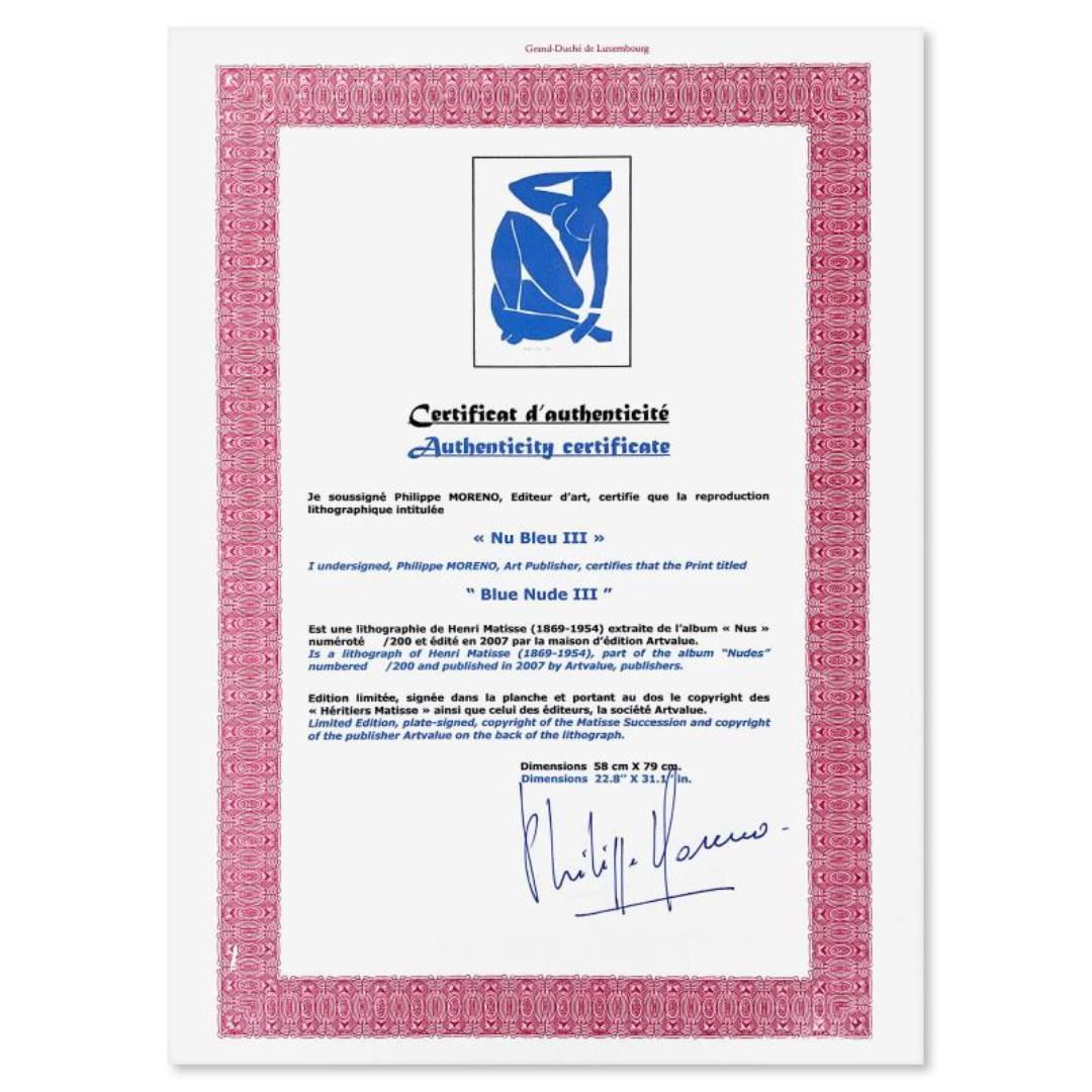 "Nu Bleu III" is a limited edition lithograph by Henri Matisse (1869-1954) bearing the plate signature of the artist. This piece comes from an edition of 200 authorized by the Matisse Estate, but the pieces in this edition are not individually numbered. This piece comes custom framed. Includes Letter Letter of Authenticity. Measures approx. 28.5" x 37" (frame), 22.5" x 31" (image).