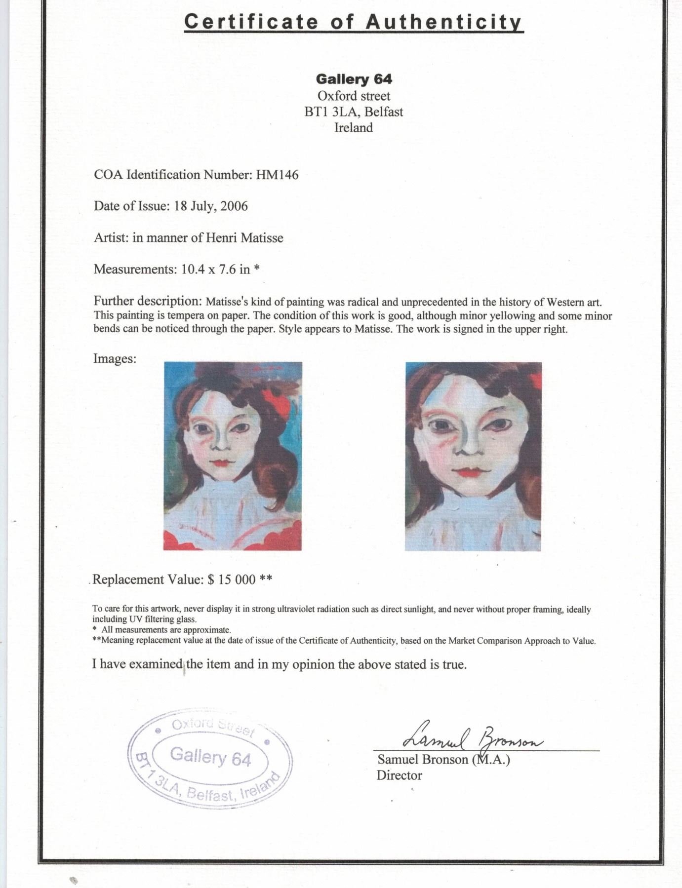 Tempera on paper, featuring portrait of a woman. Signed and attr. Henri Matisse (French, 1869-1954). Accompanied with certificate of attribution from Gallery 64, Ireland. 10.4 x 7.6 inch (26.4 x 19.3 cm). Henri Matisse was a leading figure of Fauvism and, along with Pablo Picasso, one of the most influential artists of the modern era. In his paintings, sculptures, and works on paper, Matisse experimented with vivid colors, Pointillist techniques, and reduced, flat shapes. “What I dream of is an art of balance, of purity and serenity, devoid of troubling or depressing subject matter,” he once said; his subjects of choice included nudes, dancers, still lifes, and interior scenes. Matisse’s animated brushwork and seemingly arbitrary application of bright colors, as in Woman with a Hat (1905), would prove foundational to Fauvism, while his similarly radical The Red Studio (1911) was a seminal, nearly monochromatic study in perspective. Later in life, physically debilitated, Matisse would turn to making bold, cut-paper collages. He has influenced a wide range of important 20th-century painters, from Hans Hofmann and Milton Avery to Tom Wesselmann and David Hockney. PROVENANCE: Private (Chicago, IL)