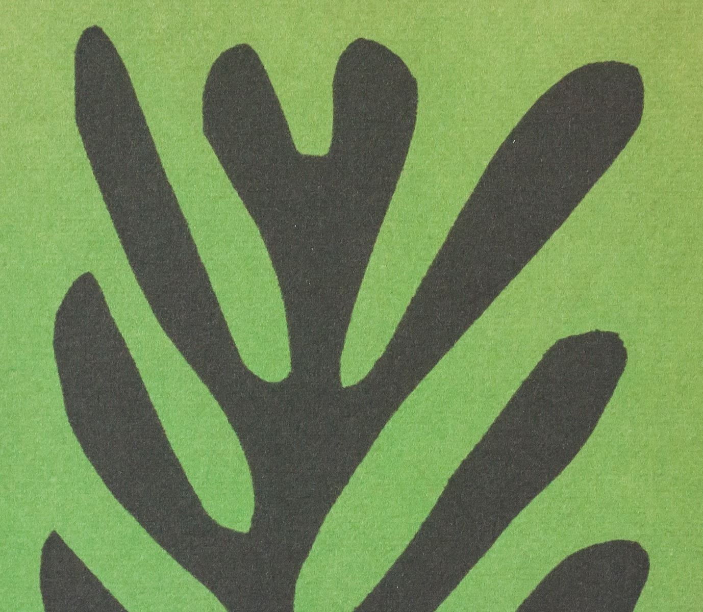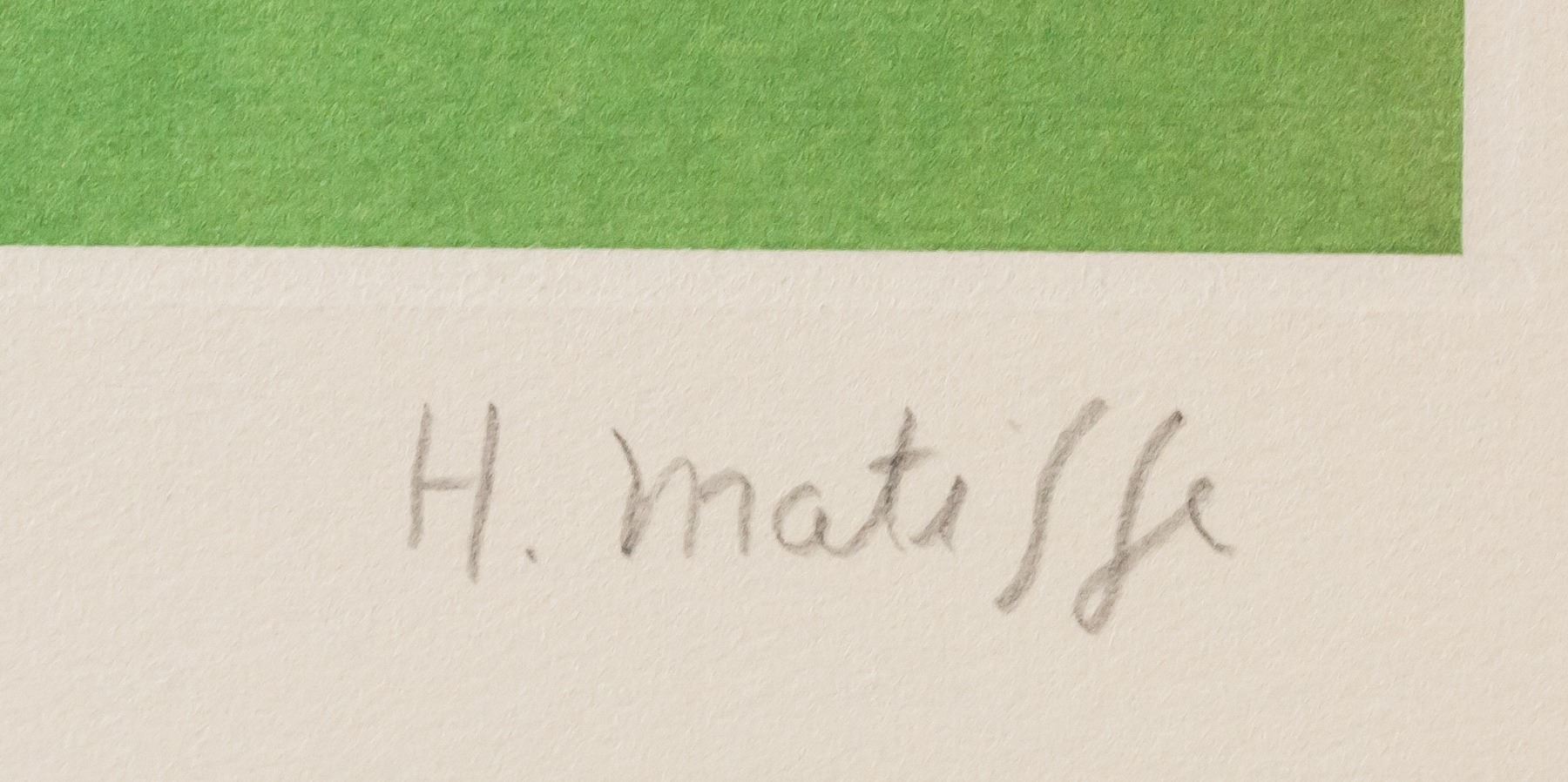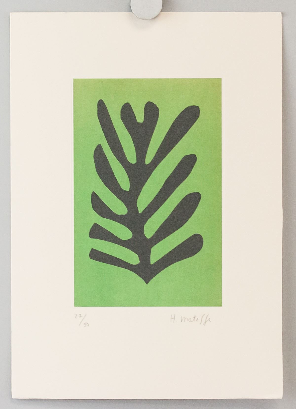 Linocut on paper. Featuring black leaf imprint on a green background. Inscribed with "27/50" beneath the bottom left corner of the image. Signed "H. Matisse" beneath the bottom right corner of the image. Attributed to Henri Matisse (1869-1954, French). Plate size: 18 x 12 cm (7 x 4.5 inches). Paper size: 30 x 21 cm (12 x 8.25 inches). Provenance: This lot carries limited provenance from a Southern Ontario estate.