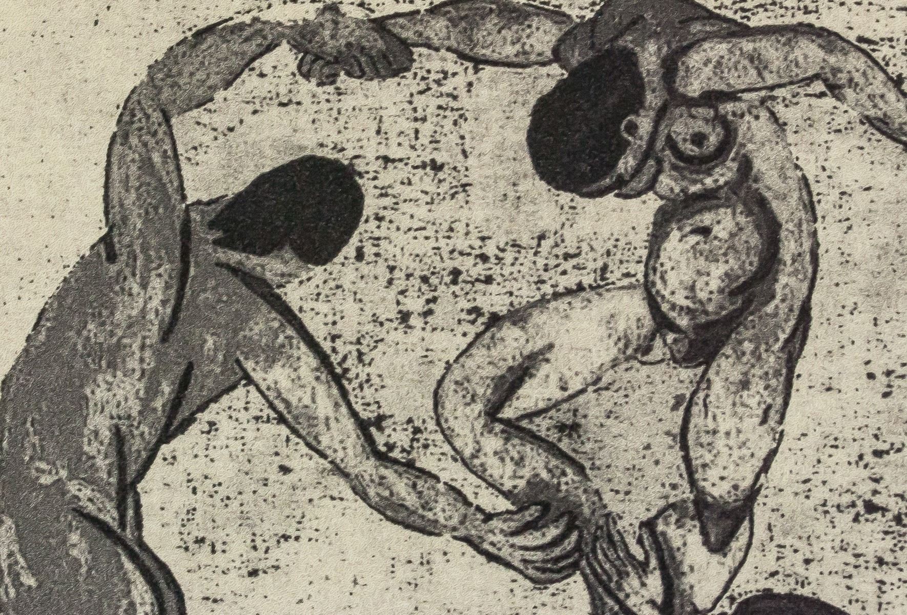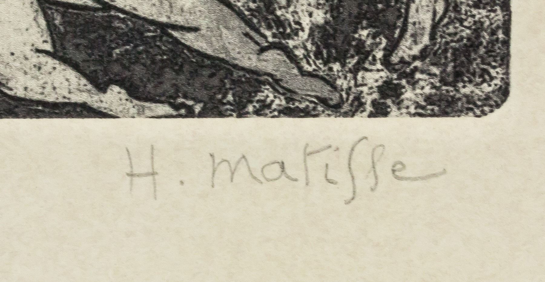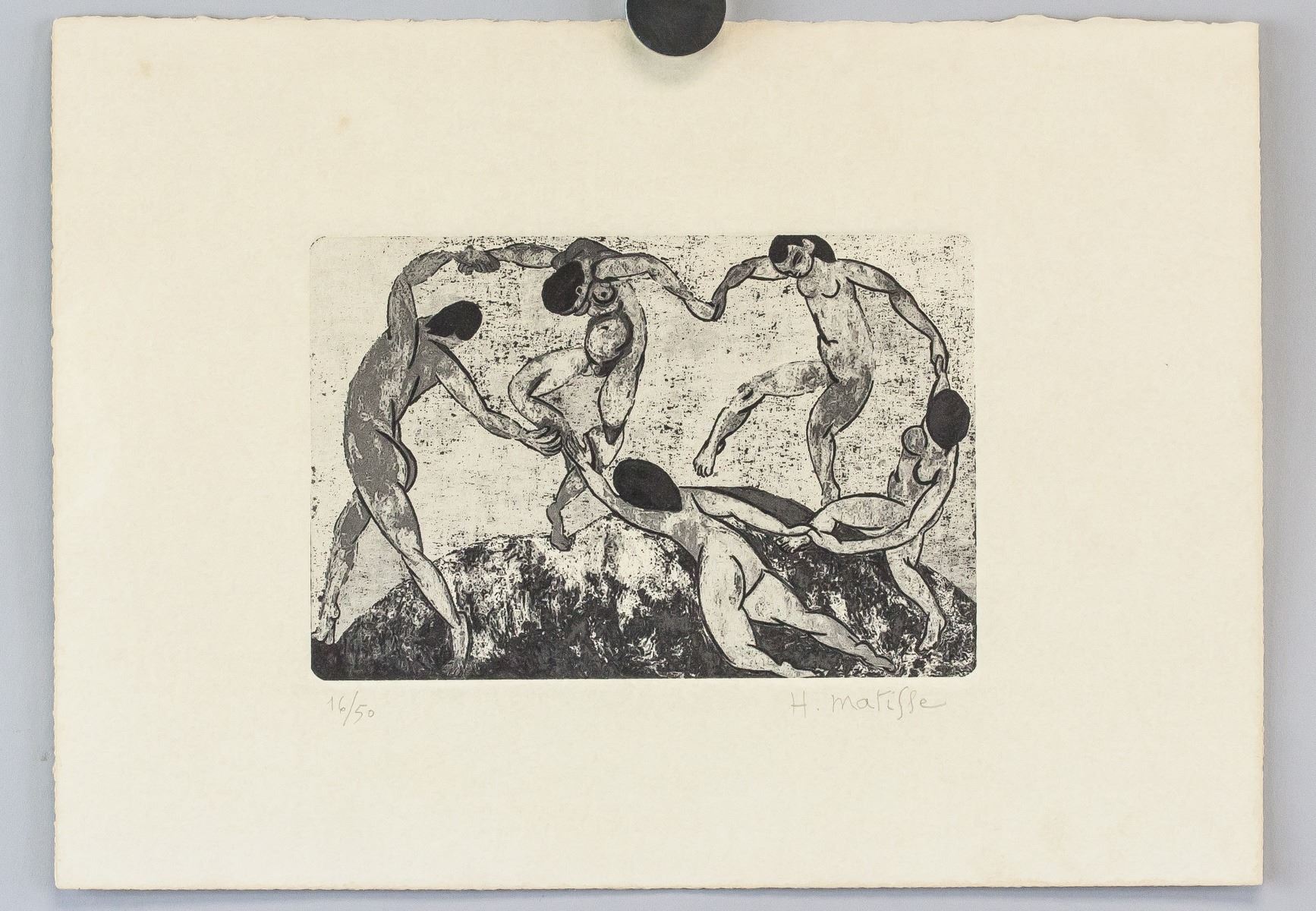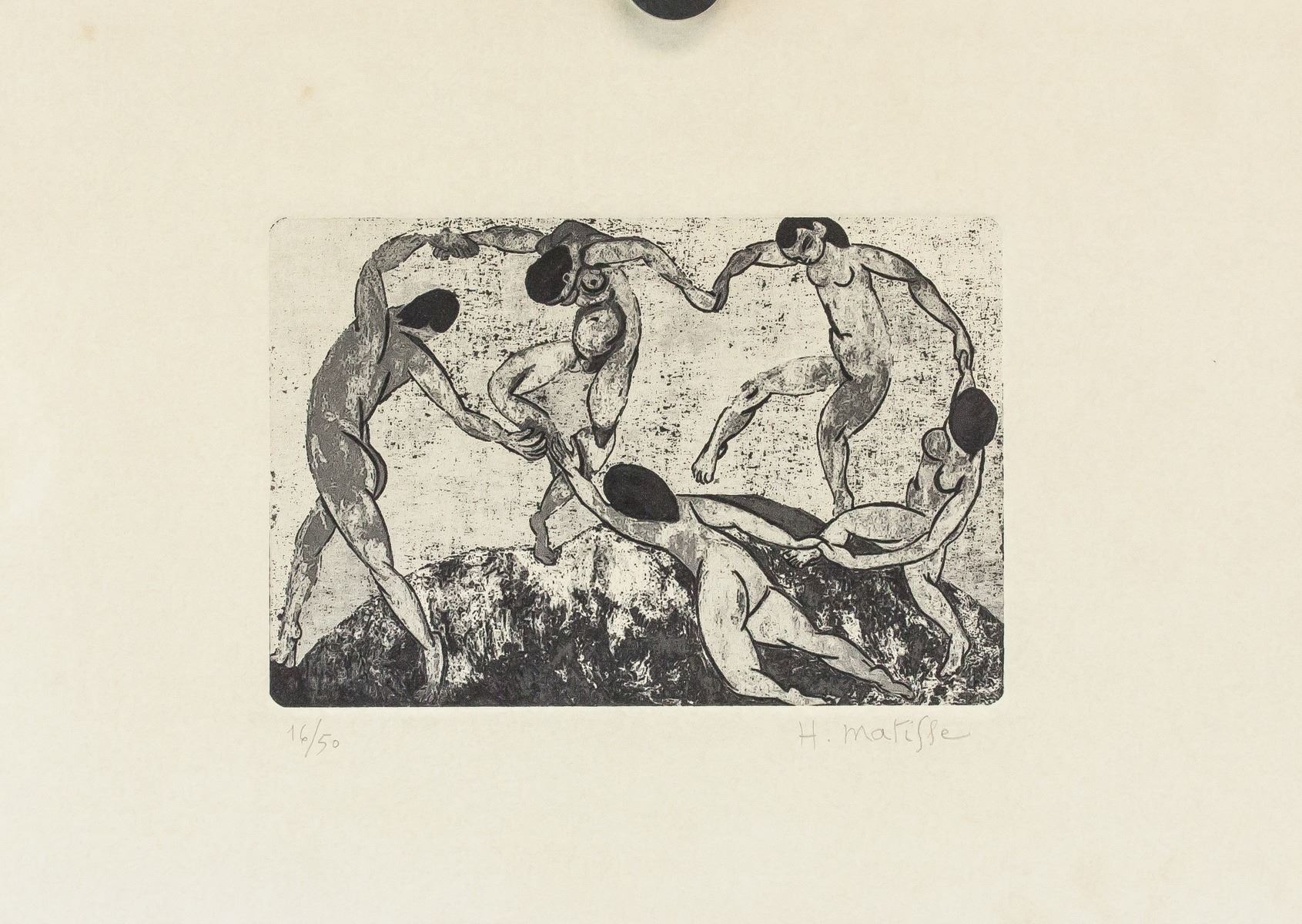 Lithograph on paper. Featuring five figures holding hands in a circle on a mountain top. Signed "H. matisse" to the bottom right with "16/50" inscribed to the bottom left. Attributed to Henri Matisse (1869-1954, French). 21.5 x 30 cm. Provenance: This lot carries limited provenance from an Upper New York estate