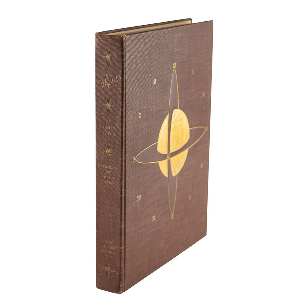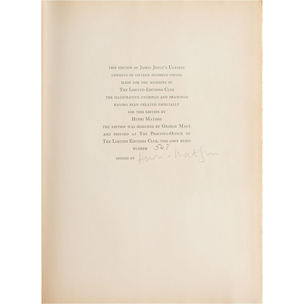 Signed book: Ulysses. Limited edition, numbered 567/1500. NY: Limited Editions Club, 1935. Hardcover bound in brown cloth-covered boards with gilt lettering and beautiful embossed gilt decoration to front, 9.25 x 12, 363 pages. Signed on the colophon in pencil, “Henri Matisse.†Autographic condition: fine. Book condition: VG-/None, with cracked hinges, light rubbing to edges, and gentle bumps to lower corners.