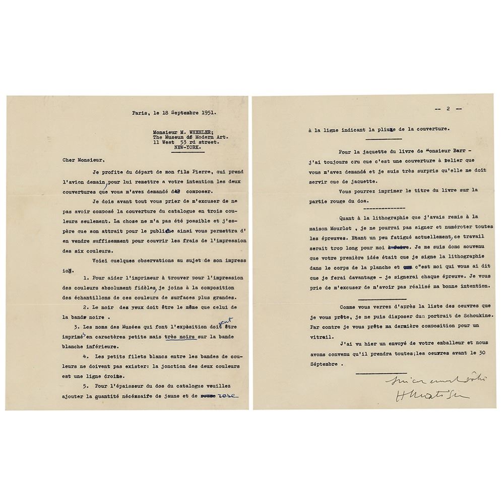 TLS in French, signed “Sincerement votre, H. Matisse,†two pages, 8.25 x 10.75, September 18, 1951. Letter to Monroe Wheeler, the Exhibitions and Publications coordinator at New York's Museum of Modern Art, in full (translated): "I take advantage of the departure of my son Pierre, who takes the plane tomorrow to give him for you the two covers that you asked me to compose. First of all, I must apologize for not having composed the cover of the catalog in only three colors. This was not possible for me and I hope that it will appeal to the public so that you will sell enough to cover the cost of printing the six colors. Here are some observations about his impression.