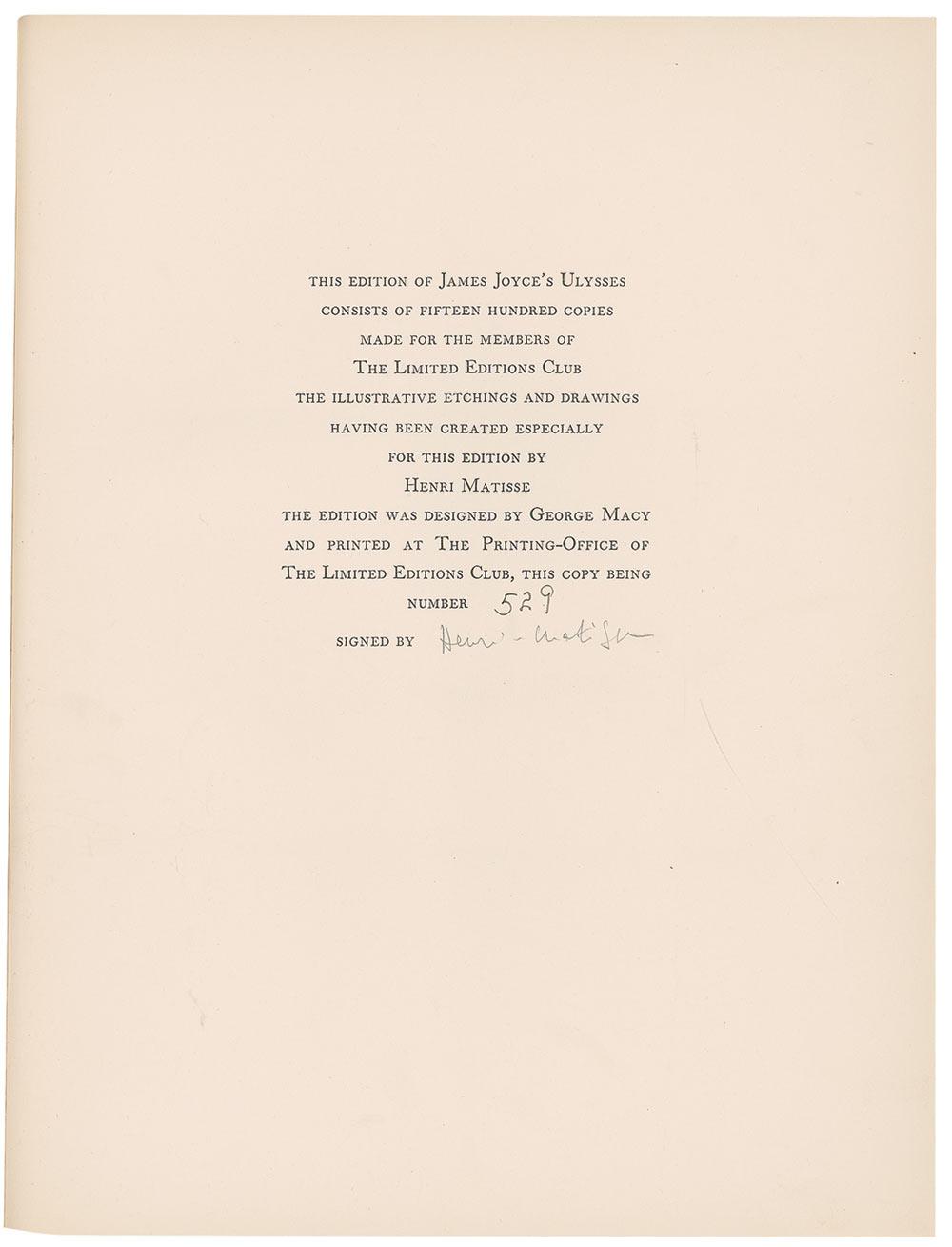 Signed book: Ulysses. Limited edition of 1500 copies (this being No. 529). NY: Limited Editions Club, 1935. Hardcover, 9.25 x 12, 363 pages. Signed on the colophon page in pencil “Henri Matisse.” In fine condition, with mild toning to opening and closing pages.