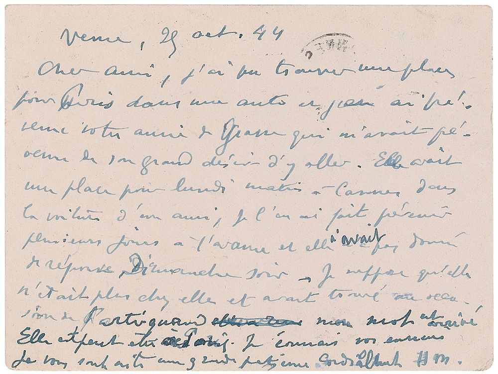 Eminent French artist (1869–1954), most closely associated with the Fauvist movement, best known for his colorful paintings, fluid drawings, and bold, distinctive cut-paper collages. ALS in French, signed “H. M.,” one page, 5.25 x 4, October 26, 1944. Letter to a friend. In full (translated): “I have let your friend from Grasse know I was able to find a seat in a car for Paris. She had informed me of her great desire to go there. She had a seat in a friend’s car for Cannes Monday morning. I let her know several days in advance and she had not replied by Sunday evening. I suppose when my note arrived she found an opportunity to leave and was not home any more. She may be in Paris. I know your worries, I wish you great patience.” Matisse has addressed the reverse, signing “H. Matisse,” in the return address panel. Light brushing to initials, a few corner creases, and light show-through from postmark at top, otherwise fine condition.
