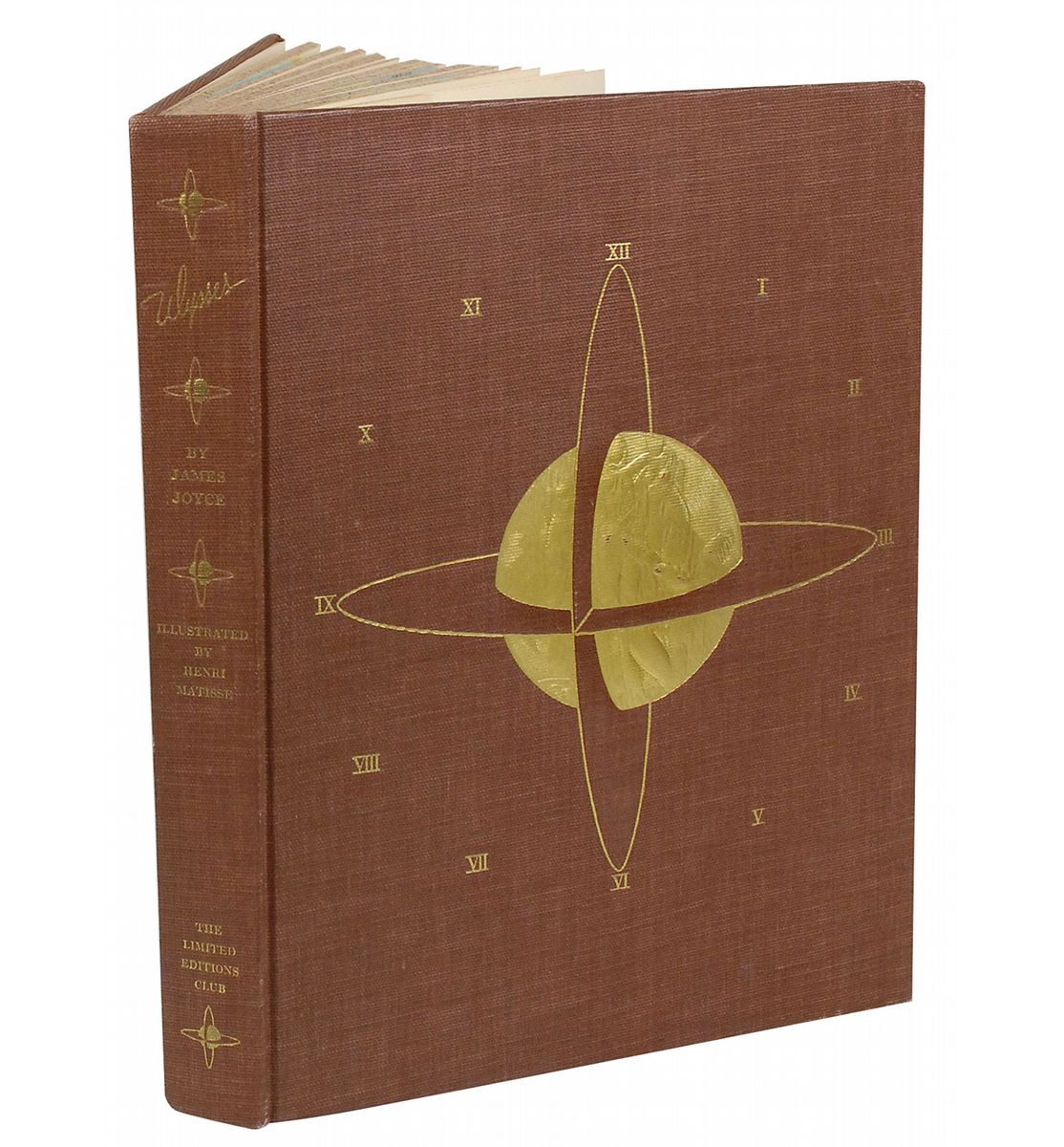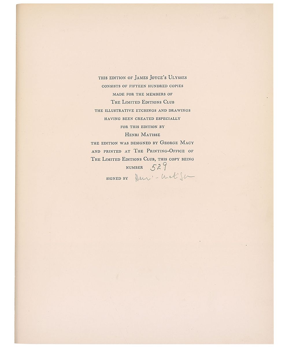 Signed book: Ulysses. Limited edition of 1500 copies (this being No. 529). NY: Limited Editions Club, 1935. Hardcover, 9.25 x 12, 363 pages. Signed on the colophon in pencil “Henri Matisse.” Autographic condition: fine. Book condition: VG+/None. Brown cloth-covered boards with gilt lettering and beautiful embossed gilt decoration to front; light rubbing to edges; gentle bump to front upper corner; light scuff to gilt illustration on front; block of discoloration to ffeps (presumably from a clipping laid in but no longer present).