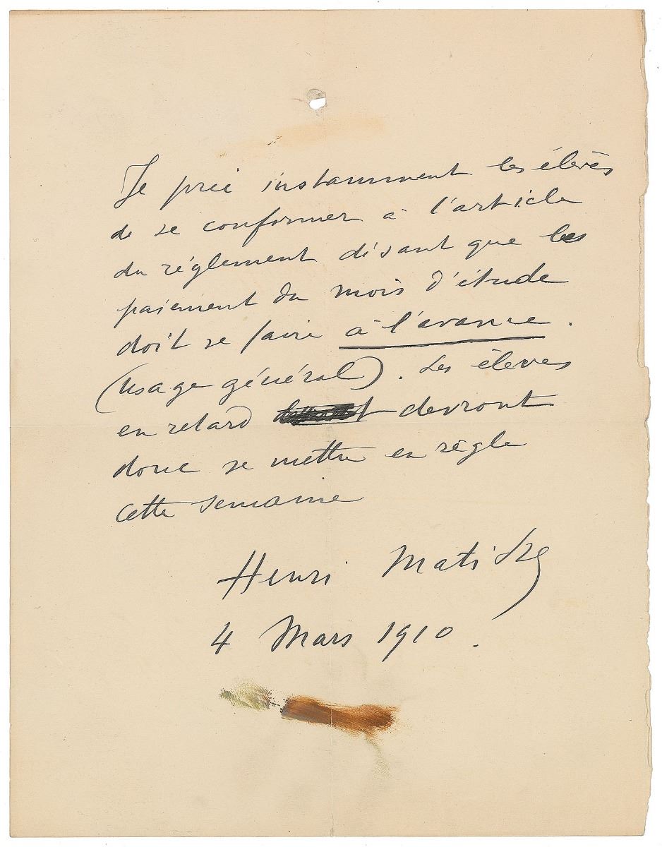 Desirable ALS in French, one page, 8.25 x 10.5, March 4, 1910. Untranslated letter to students informing them that they must pay for their class in advance according to regulations. In fine condition, with light soiling, a small hole to upper blank area, and a paint smudge in the lower margin.