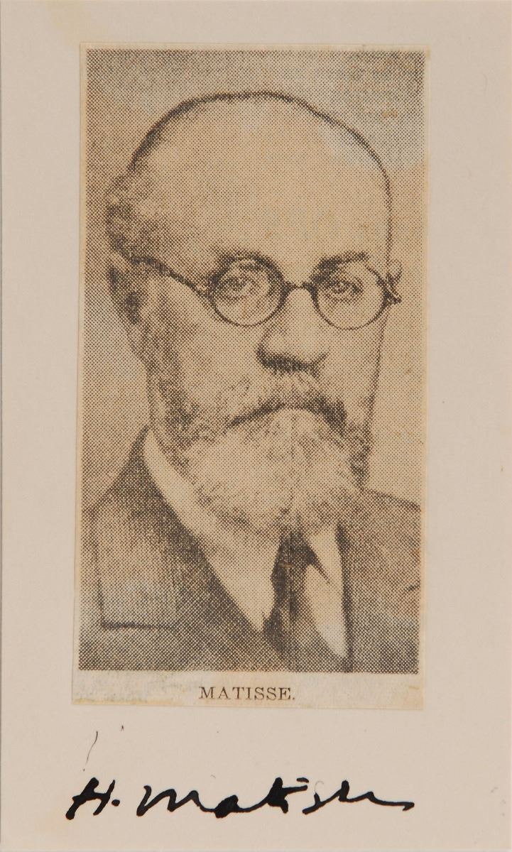 Dark fountain pen signature, “H. Matisse,” on an off-white 3 x 5 card bearing an affixed image of the French artist. In fine condition. Accompanied by the original mailing envelope, postmarked February 8, 1953.