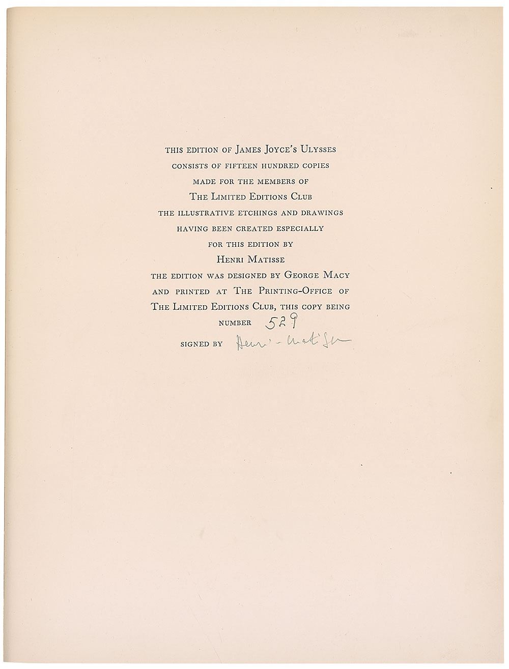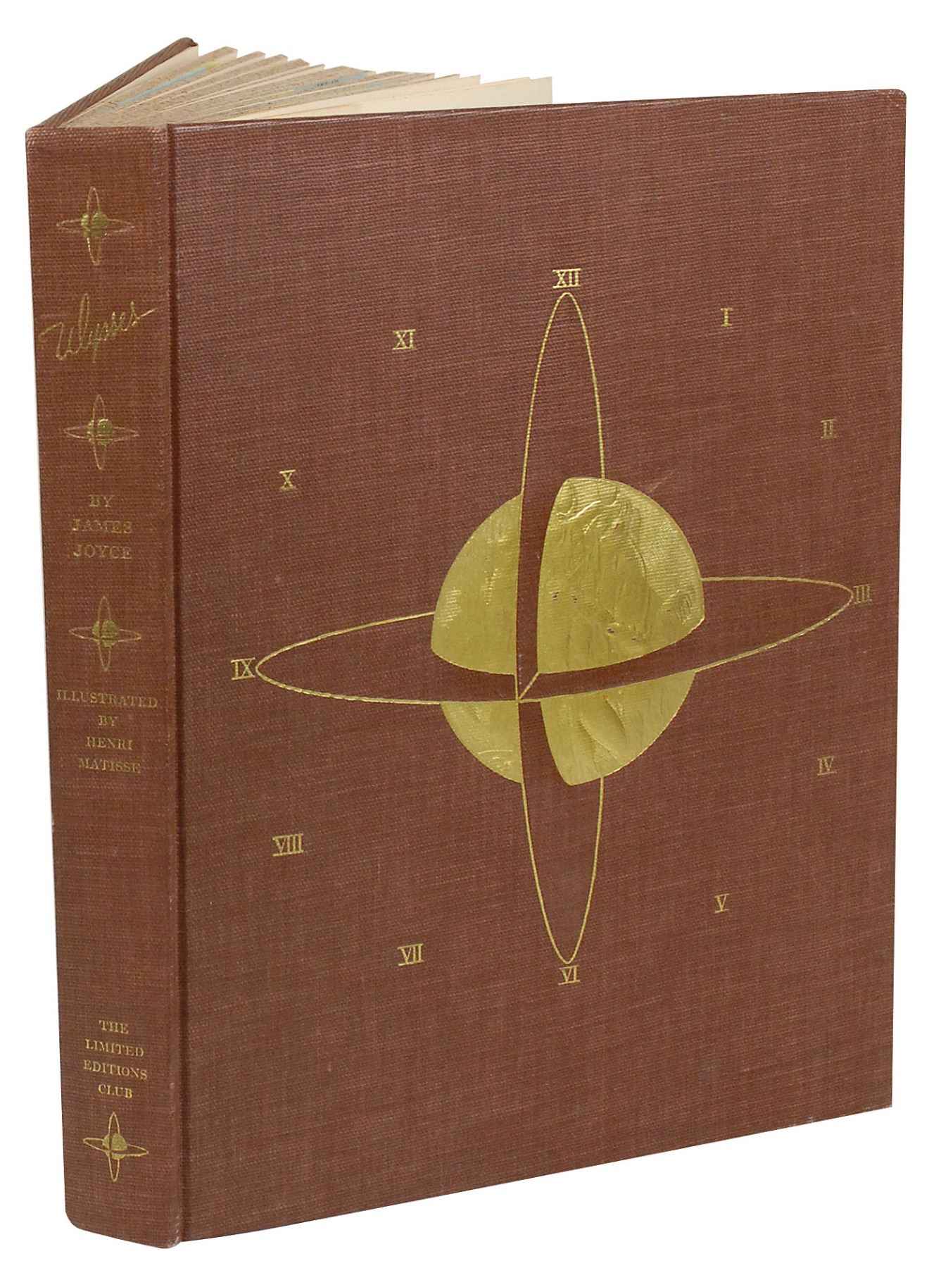 Signed book: Ulysses. Limited edition, numbered 529/1500. NY: Limited Editions Club, 1935. Hardcover, 9.25 x 12, 363 pages. Signed on the colophon in pencil “Henri Matisse.” Autographic condition: fine. Book condition: VG+/None. Brown cloth-covered boards with gilt lettering and beautiful embossed gilt decoration to front; light rubbing to edges; gentle bump to front upper corner; light scuff to gilt illustration on front; and a block of discoloration to opening free end pages.