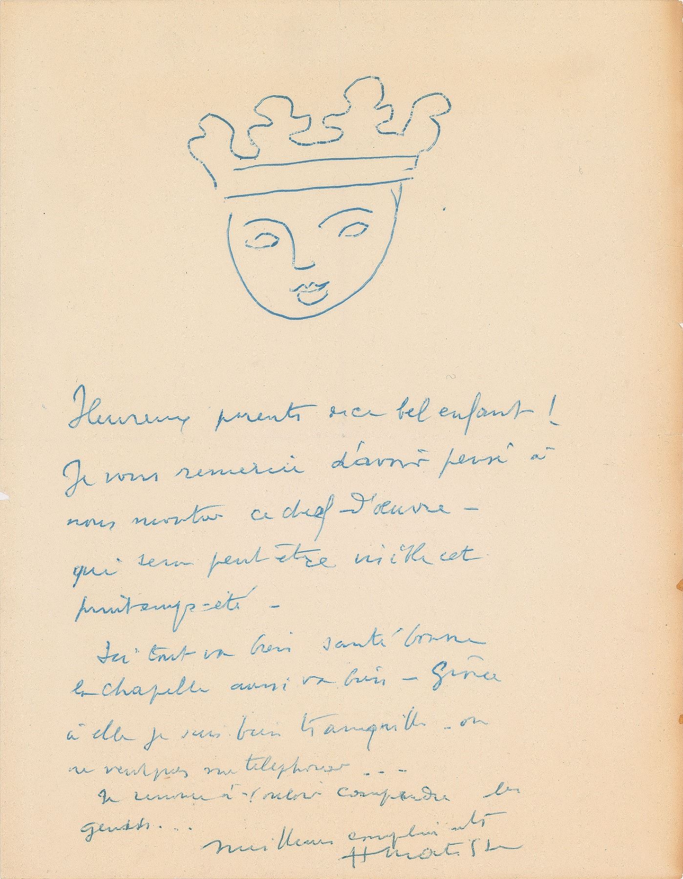 ALS in French, signed “H. Matisse,” one page, 8.25 x 10.5, no date. Fantastic letter boasting an outstanding original ballpoint sketch of a person wearing a crown. In full (roughly translated): "Happy father and mother of this beautiful child! Thank you for thinking in showing to us this masterpiece. All goes well here, good health, the chapel goes well too. I give up wanting to understand people." In fine condition, with intersecting folds and a few trivial edge tears.