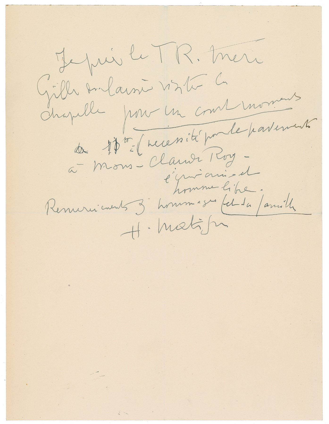 ALS in French, signed "H. Matisse," one page, 8.25 x 10.5, no date. In full (translated): "I am asking the TR. Mother Gille to let the chapel be visited for a short time at 11 o'clock (necessary for ornamental tiling in Mons-Claude Roy-writer and free man and his family). Thanks and homage." In fine condition, with light creasing along the right edge. Especially interesting content considering Matisse's famous work on the Chapelle du Rosaire de Vence in France, which is considered one of the great religious structures of the 20th century.