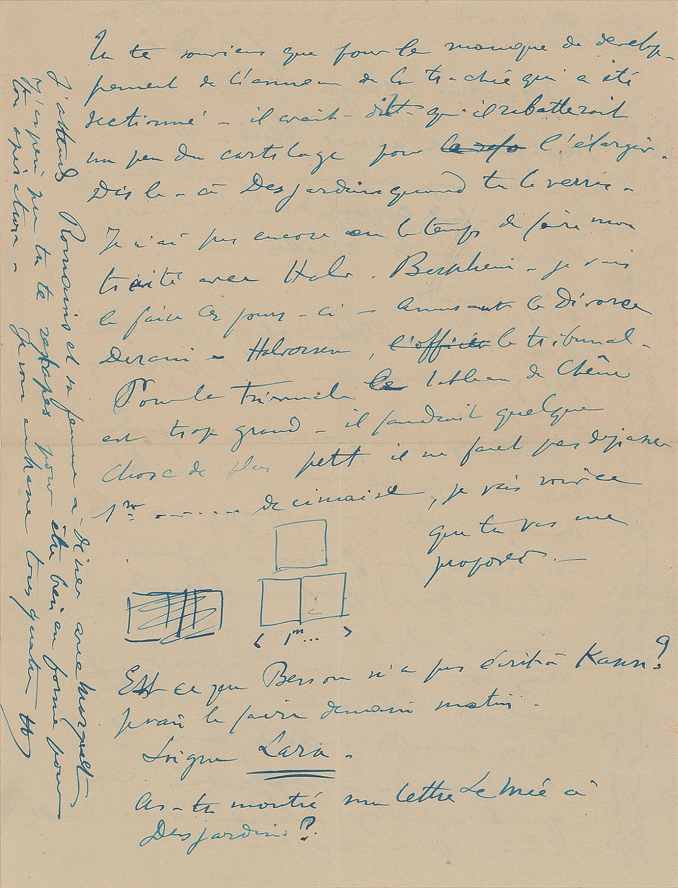 Matisse continues: "Remember that it is because the ring of the trachea that has been cut has not developed, he said that he would cut back the cartilage a little to enlarge it. Tell Desjardins when you see him. I haven't had time to work out my contract with Halv. Bernheim. I'll do it one of these days.—Amusing, the Derain-Halvorsen divorce, the court. To move around the oak frame is too large. What is needed it something smaller. It shouldn't be bigger than 1 m of the hanging rail. I'll see what you will suggest." Matisse sketches a quick diagram of boxes. In the left margin, he writes: "I am expecting Romains and his wife for dinner with Marquet. I hope you will get back in shape for your operation. I send hugs to all four of you. H." In fine condition. A significant letter from Matisse to his daughter, who acted as his model, muse, and manager. Here, he touches upon his work—referring to his 1914 portrait of Yvonne Landsberg—and her ailment—Marguerite wore a black ribbon around her neck to hide a three-inch scar from surgery on her trachea and larynx, as seen in Matisse's many famous portraits of her. He also refers to his lifelong friend, the Fauvist painter Albert Marquet, as well as the world-famous Louvre Museum. A desirable autograph letter boasting a number of important associations.