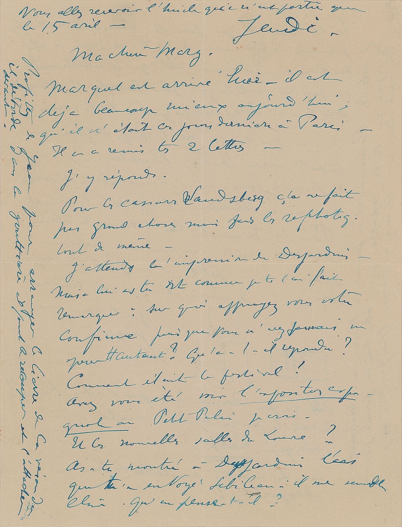 ALS in French, signed “H.,” one page both sides, 7.75 x 10.25, no date. Letter to his daughter Marguerite, "My dear Marg," in part (translated): "Marquet arrived yesterday. He is already much better today than he was the last days in Paris. He brought me your two letters. Here are my answers: As for the Landsberg…don't worry about it, but have them rephotographed anyway. I am waiting what Desjardins has to say, but he, did you say as I told you to: what do you base your confidence on, considering you've never been that afraid? What was his answer? How was the festival? Did you go see the Spanish exhibit at the Petit Palais Paris? And the new rooms at the Louvre? Did you show Desjardins what you sent to Sebileau? It seems clear to me. What does he think of it?" In the left margin, he adds: "Use Jean to take care of the ivy by the veranda. It covers the gutter and needs to be cut back and attached in front." At the top of the page, he writes: "You will receive the oil; it didn't get sent until the 15th of April."