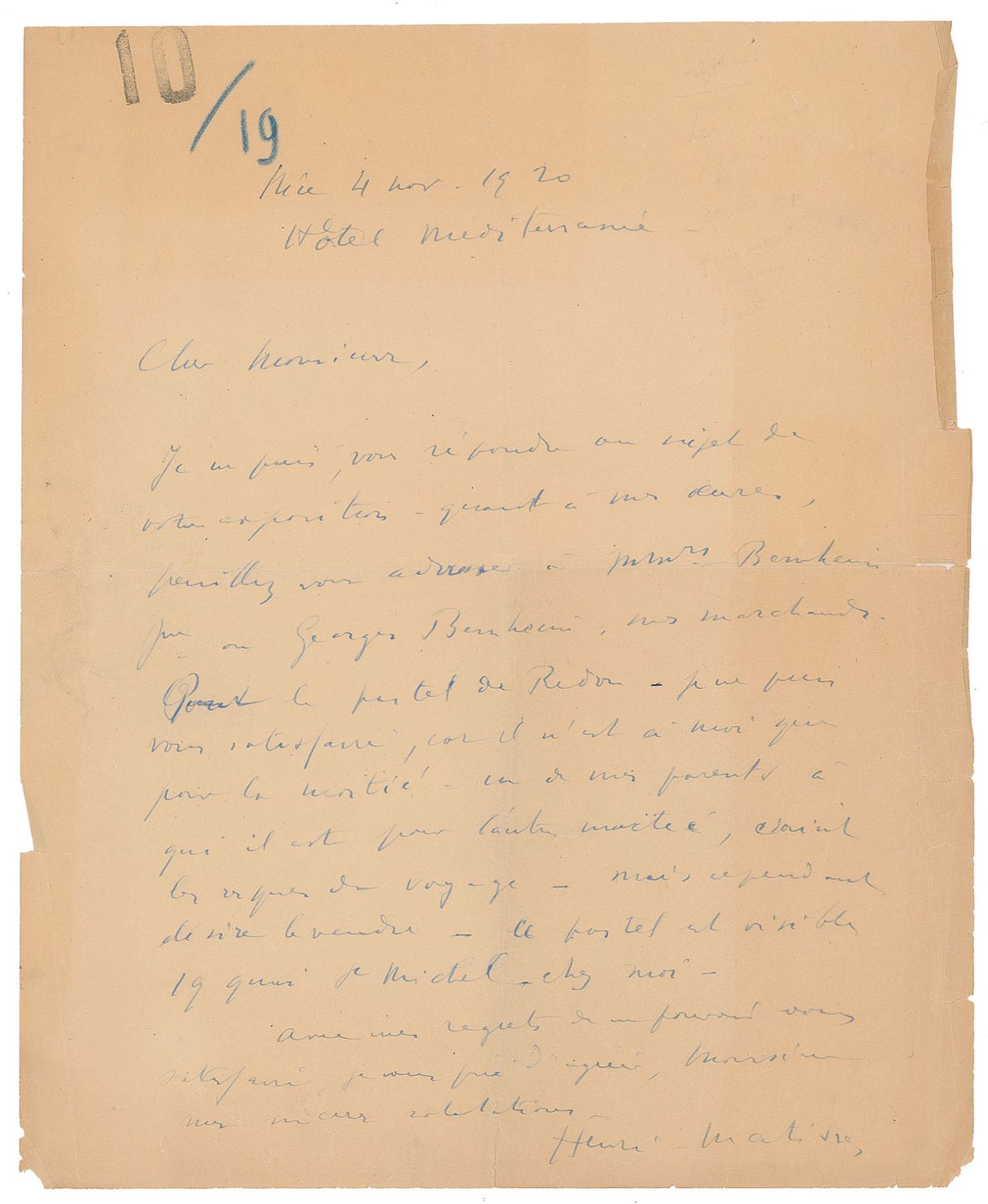 ALS in French, one page, 8.25 x 10, November 4, 1920. Letter to Paul Colin of L'Art Libre, written from the Hotel Mediterranée. In part (translated): "I cannot give you any answer regarding your exhibit; as far as my works are concerned, please contact Messrs. Bernheim or Mr. Georges Bernheim, my dealers. As for the pastel by Redon, I will not be able to satisfy you because I own only half of it and my relative who owns the other half fears the risks of a trip but still wants to sell it. The pastel can be seen at 19 quai St. Michel, at my place." In very good to fine condition, with creasing, and short tears, to the edges. A fantastic letter referencing Odilon Redon, an artist whom Matisse greatly admired; he had purchased some of Redon's paintings for his father, and acknowledged the influence of Redon's pastels on his own colorful Fauvist palette.