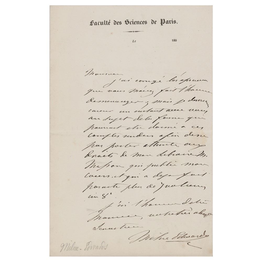 Untranslated ALS in French, signed “Milne Edwards,†one page, 5.25 x 8, Faculte des Sciences de Paris letterhead, no date. In fine condition.