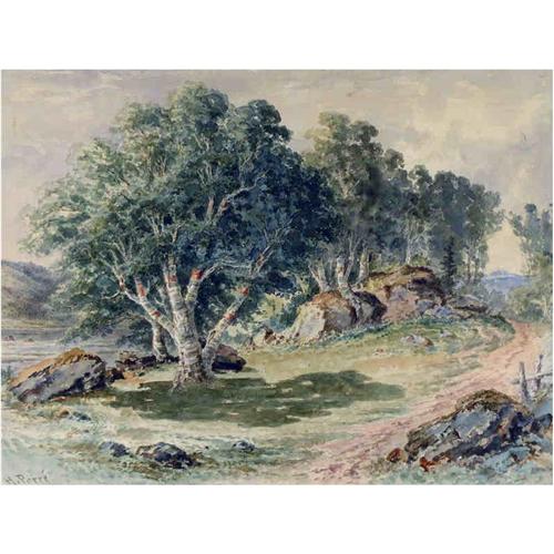[Canadian OSA, RCA 1828-1890] UNTITLED (TREES ON A ROCKY OUTCROP) Watercolour on paper 16.5 x 22 in. Signed.