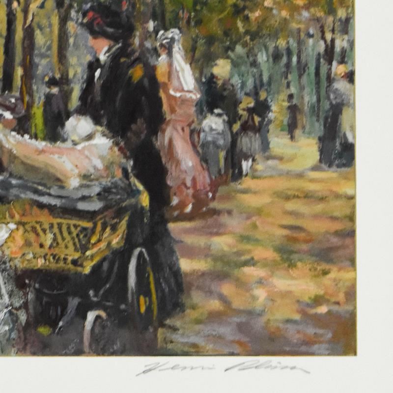 "Stroll in the Park" is a limited edition serigraph on paper by Henri Plisson, HC numbered 1/20 and hand signed by the artist. Includes Letter of Authenticity. Measures approx. 20" x 17" (border), 15" x 11" (image).