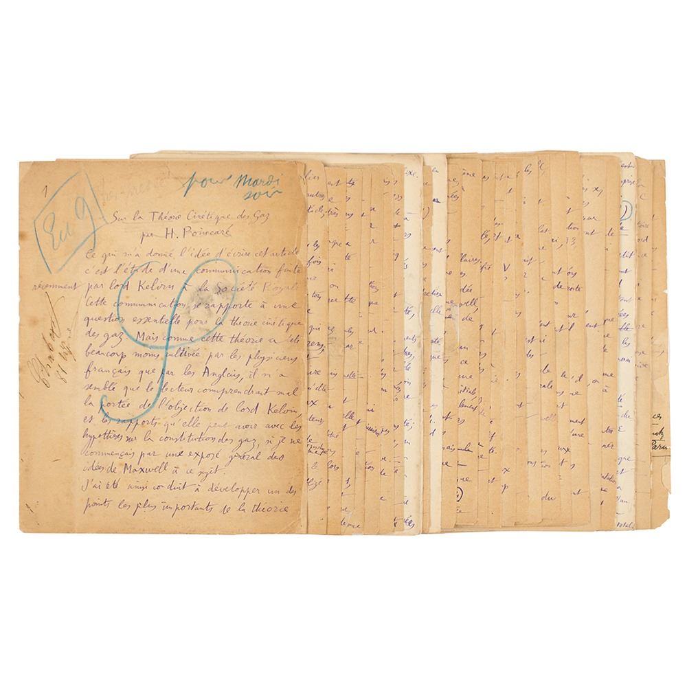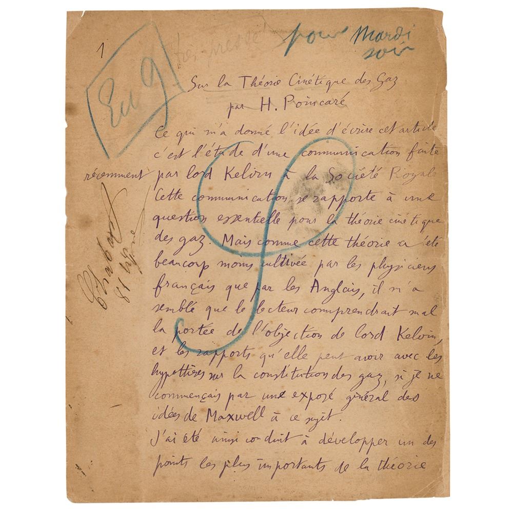 French mathematician, physicist, and philosopher of science (1854-1912) who famously formulated the 'Poincare Conjecture,' which went unsolved for nearly a century. Handwritten scientific manuscript in French, titled and signed by Henri Poincare, "Sur la Théorie Cinétique des Gaz par H. Poincare," totaling 41 pages, circa 1894. Published in Volume 5 of the Revue Générale des Sciences Pures et Appliquées (1894), the paper contains Poincare's detailed exposition of Maxwell's kinetic theory of gases, written for the benefit of the French scientific community. Poincare observes that the French are far less familiar with Maxwell's ideas than their British counterparts ("cette théorie a été beaucoup moins cultivée par les physiciens francais que par les anglais"). James C. Maxwell, along with Rudolf Clausius, had been responsible for establishing the complex kinetic theory of gases in the 1860s, which even thirty years later were still being debated by the likes of Lord Kelvin. Poincare notes Kelvin's unspecified "objection" to Maxwell's theory in the first paragraph of this paper. The draft has approximately 100 small corrections, emendations or excisions, and printer's pencil marks throughout. In very good to fine condition, with scattered soiling, chipped edges, and small professional repairs, including silking to the back of the final page. Accompanied by a photocopy of the paper as printed in the Revue Générale.