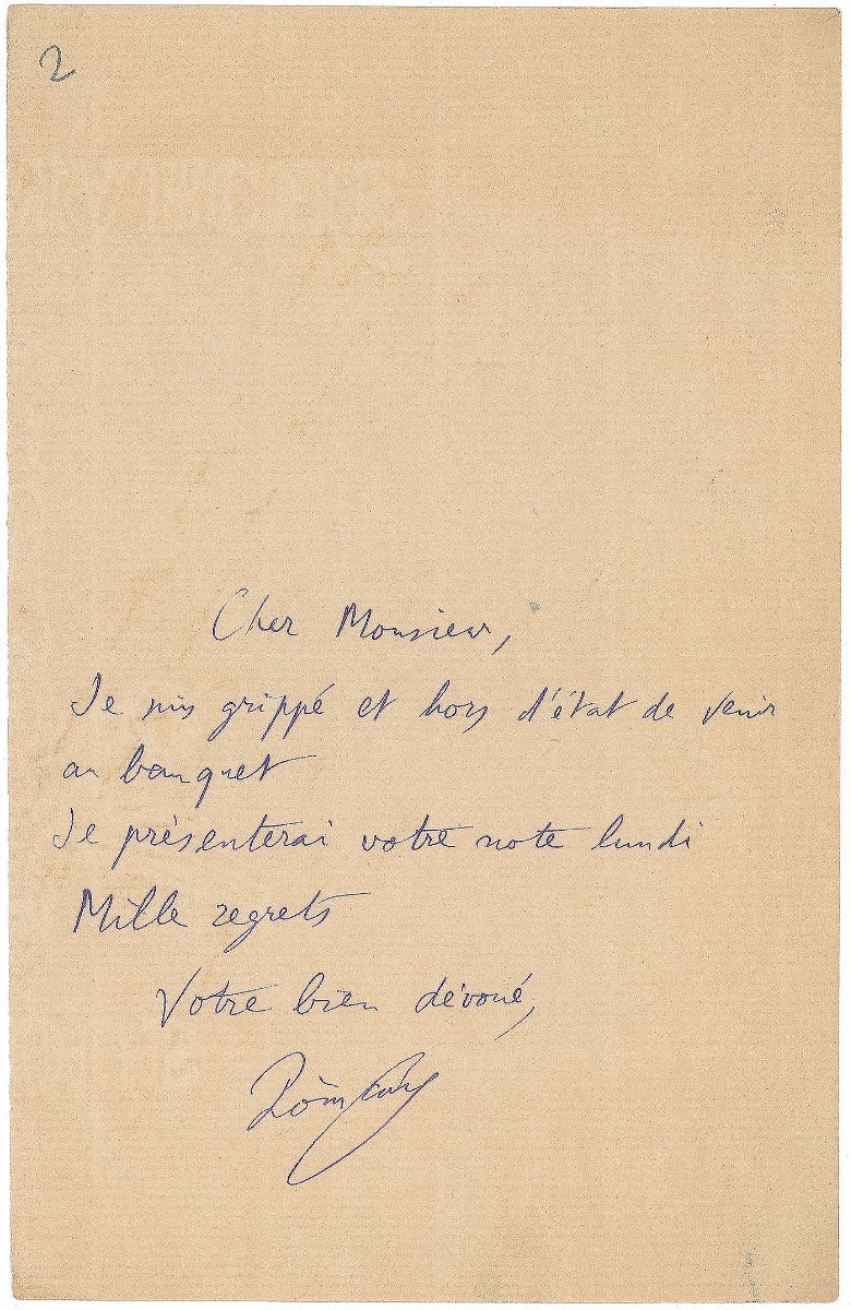 French mathematician, physicist, and philosopher of science (1854–1912) who famously formulated the ‘Poincare Conjecture,’ which went unsolved for nearly a century. Scarce ALS in French, signed “Poincare,” one page, 4.5 x 7, no date. Untranslated letter to social psychologist Gustave Le Bon, regretfully declining an invitation to attend a banquet due to sickness. In fine condition.