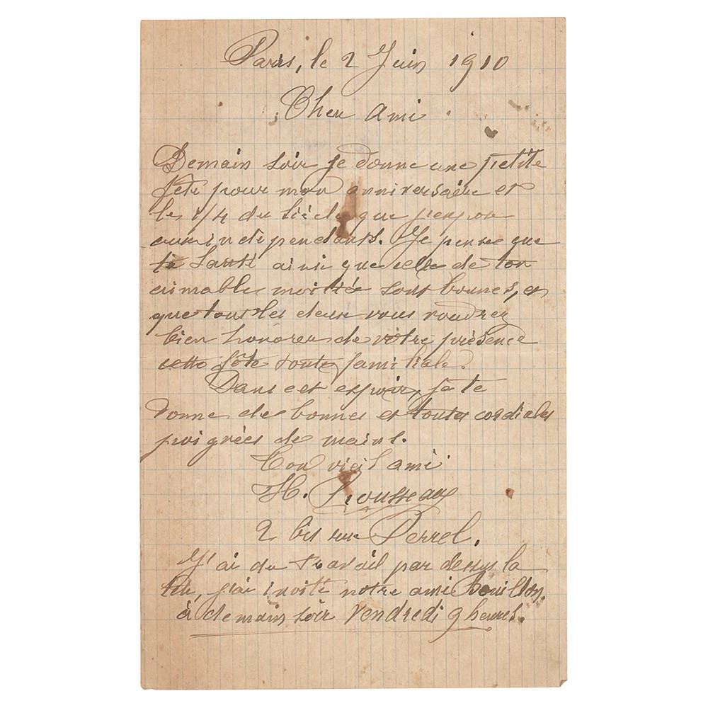 Extremely rare ALS in French, signed “H. Rousseau,†one page, 5.25 x 8.25, June 2, 1910. Writing from Paris ninety days before his death, Rousseau invites his correspondent to a party celebrating his work. In part: "Tomorrow night, I'll give a small party for my anniversary and for the quarter century that I have shown my work with the Indépendants. I hope that your health as well as that of your better half is good, and that both of you will be willing to honor this family party with your presence. In this hope, I send you my very cordial handshake." He pens his address as "2 bis rue Perrel," and adds a brief postscript: "My workload goes over my head, but I have also invited our friend Bouillon tomorrow night, Friday at 9." In fine condition, with scattered small stains. This is the first Rousseau letter that we have handled.