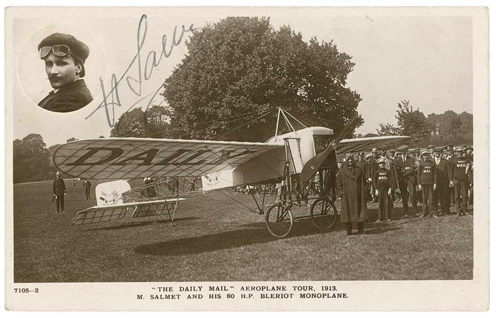 French aviator. Vintage 5.5 x 3.5 postcard photo of Salmet and his Bleriot monoplane in 1913, signed in fountain pen, “H. Salmet.” In fine condition, with some scattered light surface marks.