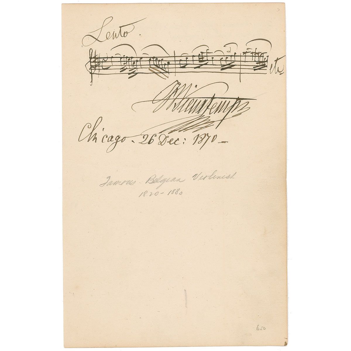 Belgian composer and violinist (1820–1881) considered an essential part of the Franco-Belgian violin school during the mid-19th century. AMQS on an off-white 5.25 x 8 sheet. Vieuxtemps pens three bars of music from an unidentified work, headed at the top, “Lento,” and signed underneath, “H. Vieuxtemps, Chicago. 26 Dec: 1870.” Pencil notation under signature, some scattered toning, and a central horizontal crease, otherwise fine condition.