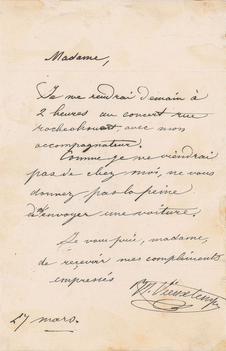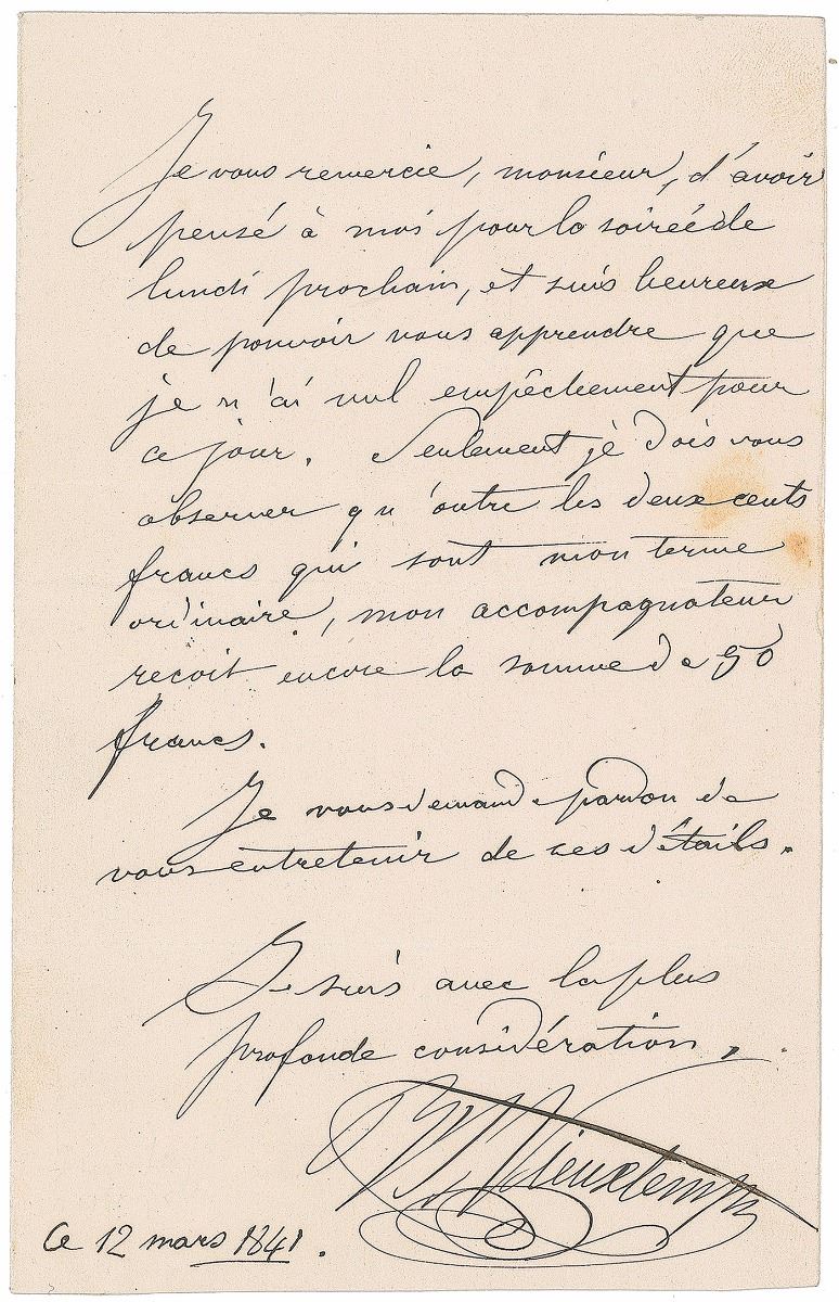 Belgian composer and violinist (1820–1881) considered an essential part of the Franco-Belgian violin school during the mid-19th century. Two ALSs in French, each signed “H. Vieuxtemps,” one page, March 12 and 27, 1841. The first, in part (translated): "My usual terms are 200 francs, my accompanist still gets the sum of 50 francs.” The second, in part (translated): "I will go to the concert on Rochechouart Street tomorrow at 2 o'clock with my accompanist. Since I won't be coming from my house, please don't trouble to send a carriage for me.” In very good to fine condition. Accompanied by an unsigned albumen photo. The Salle Pleyel, 22 rue Rochechouart, was a famed concert hall where Chopin, Liszt, Paganini and many others appeared.