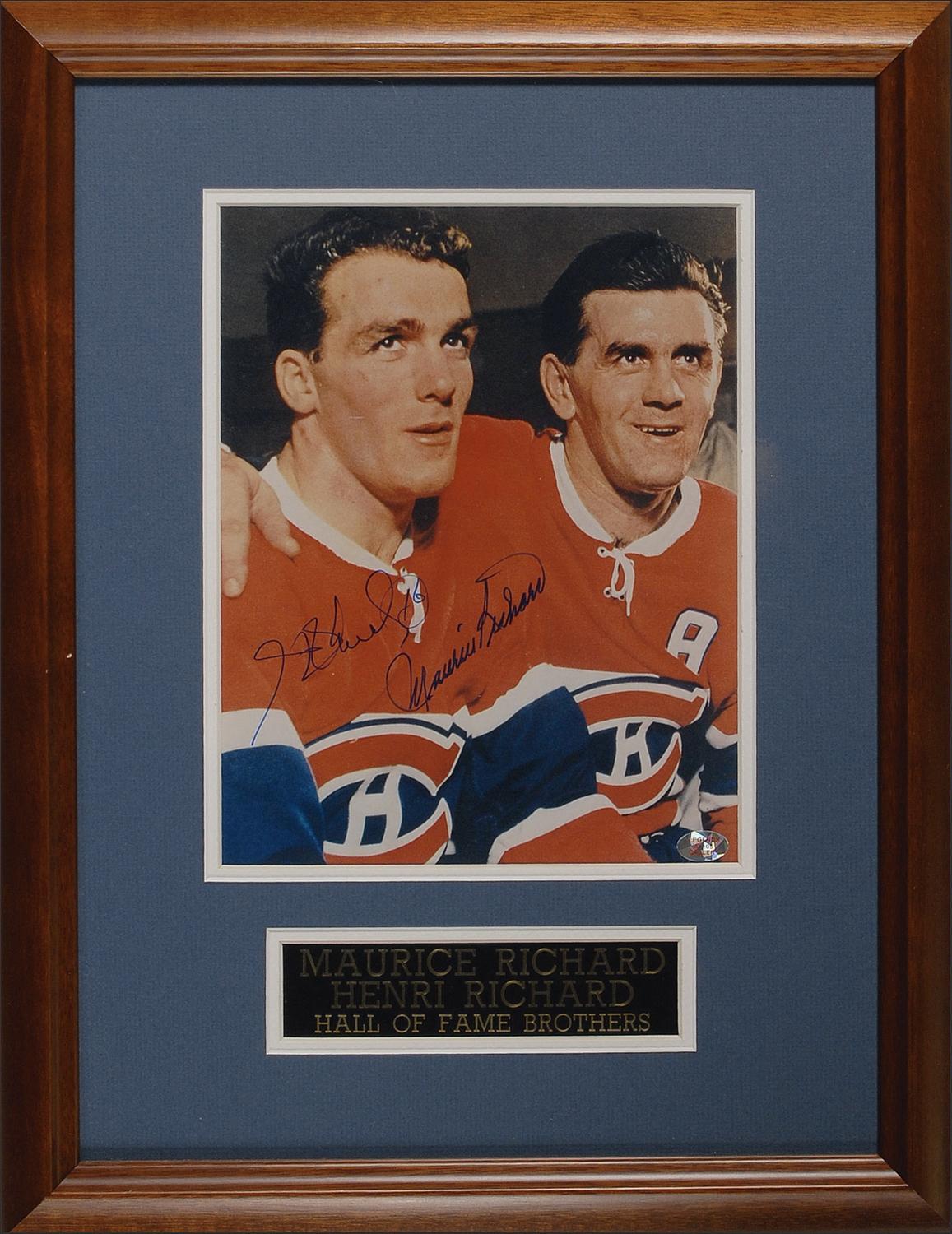 Color glossy 7.5 x 9.5 photo of Henri and Maurice Richard, signed in blue felt tip by both brothers. Matted with a small plaque and framed to an overall size of 14 x 18. In fine condition.