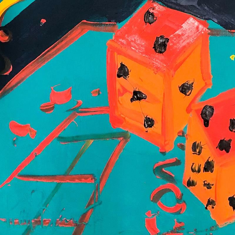 "7 Come 11" is an original oil painting on stretched canvas by Paul Blaine Henrie (1932-1999). The piece is hand signed by the artist and comes with a letter of authenticity. Please note that due to the age of this piece and the way it was stored, there are minor sings of wear, particularly on the corners and edges. Measures approximately. 48" x 30" (image).