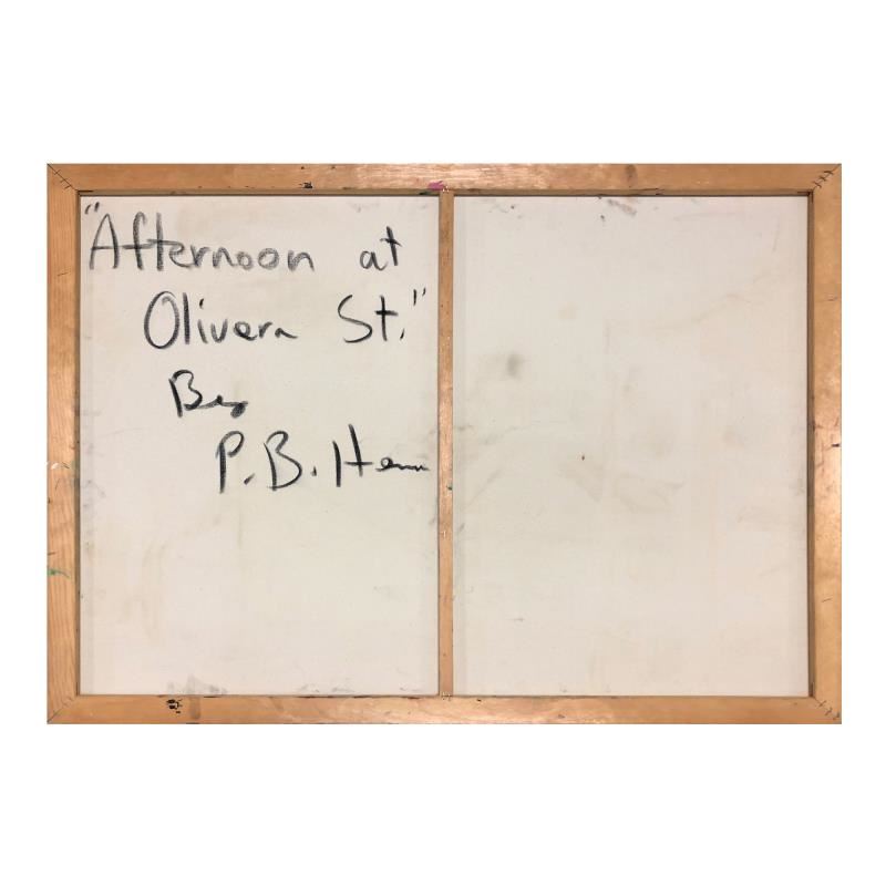 "Afternoon on Olivera St" is an original oil painting on stretched canvas by Paul Blaine Henrie (1932-1999). The piece is hand signed by the artist and comes with a letter of authenticity. Please note that due to the age of this piece and the way it was stored, there are minor sings of wear, particularly on the corners and edges. Measures approximately. 30" x 40" (image).