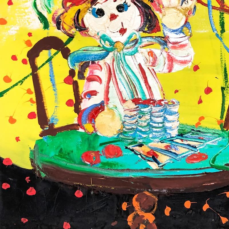 "Poker Face" is an original oil painting on stretched canvas by Paul Blaine Henrie (1932-1999). The piece is hand signed by the artist and comes with a letter of authenticity. Please note that due to the age of this piece and the way it was stored, there are minor sings of wear, particularly on the corners and edges. Measures approximately. 40" x 30" (image).