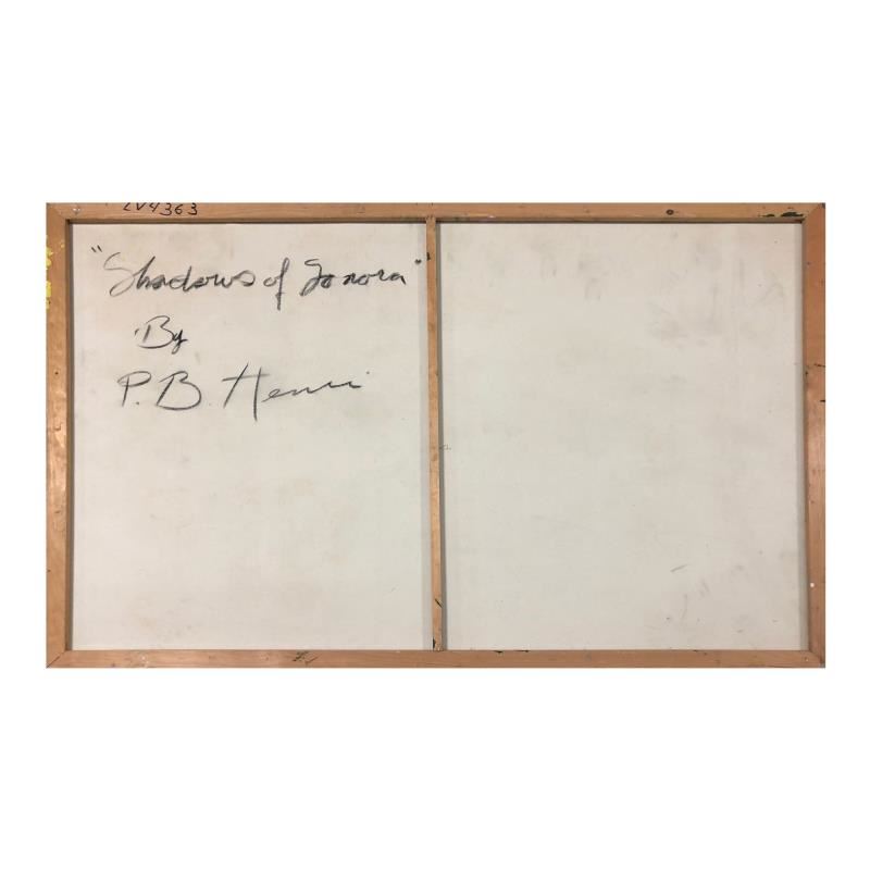 "Shadows of Sonora" is an original oil painting on stretched canvas by Paul Blaine Henrie (1932-1999). The piece is hand signed by the artist and comes with a letter of authenticity. Please note that due to the age of this piece and the way it was stored, there are minor sings of wear, particularly on the corners and edges. Measures approximately. 40" x 60" (image).