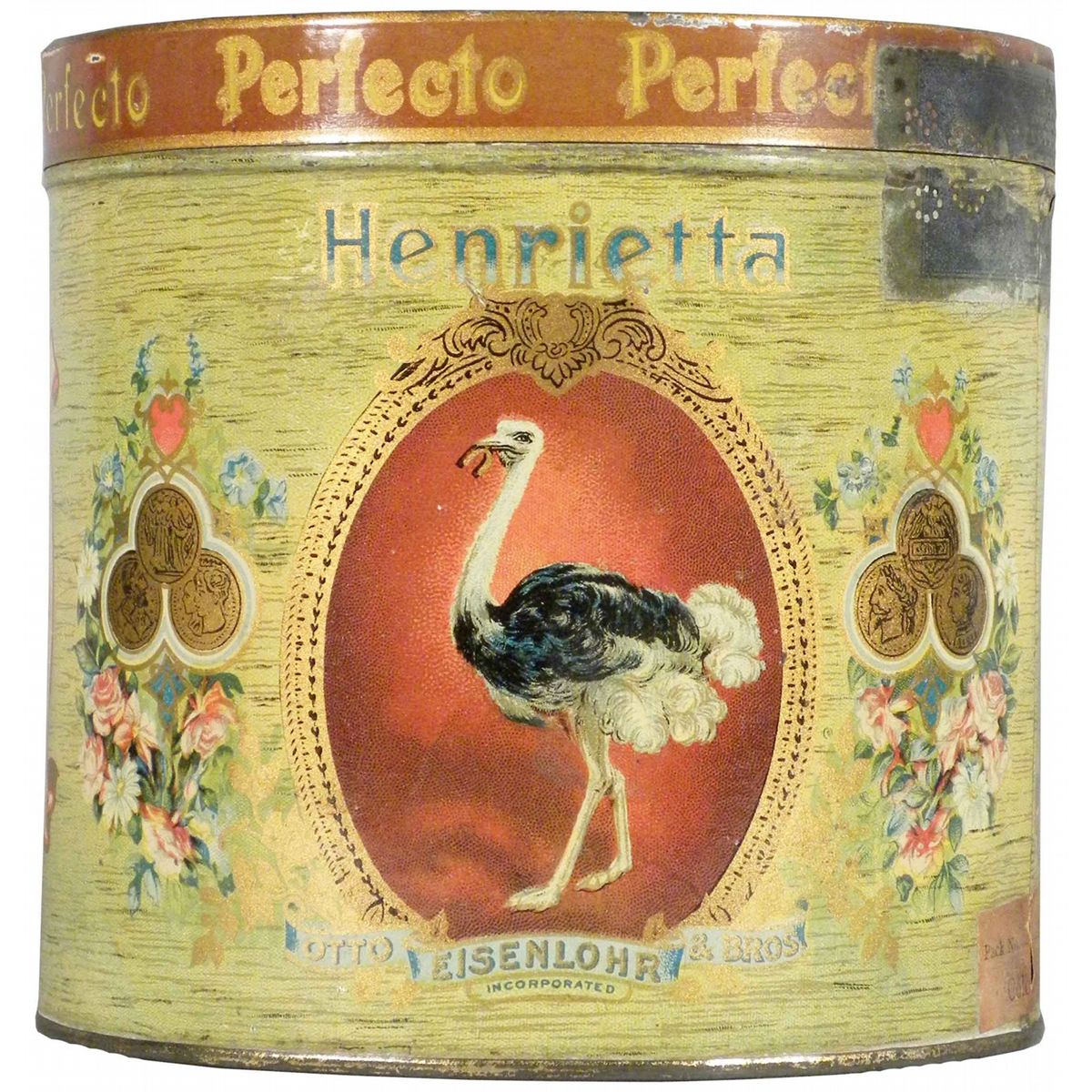 Henrietta Cigar Tin for 50 Cigars. Mfg. for Otto Eisenlohr & Bros. A few light rubs and light scratches otherwise very good condition. 5 inches tall X 5 1/4 inch diameter.