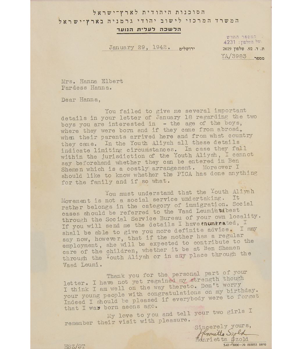 Zionist leader (1860–1945) who worked for the Jewish Publishing Society of America before she founded Hadassah in 1912. TLS, one page, 6.5 x 9.5, Hebrew letterhead, January 29, 1942. Letter to Hanna Elbert. In part: “You failed to give me several important details in your letter…the age of the boys, where they were born and if they came from abroad, when their parents arrived here and from what country they came. In the Youth Aliyah all these details are limiting circumstances…I cannot say beforehand whether they can be entered in Ben Shemen which is a costly arrangement…You must understand that the Youth Aliyah Movement is not a social service undertaking. It rather belongs in the category of immigration…If the mother has a regular employment, she will be expected to contribute to the care of the children, whether it be at Ben Shemen through the Youth Aliyah or in any place through the Vaad Leumi.” Double-matted and framed with a photo of Szold to an overall size of 18 x 15.5. In very good condition, with central vertical and horizontal folds, scattered creases and soiling, an area of dampstaining to the lower border, and show-through from postmark ink near the signature. The Youth Aliyah organization rescued thousands of Jewish children from the Nazis during World War II, with Szold overseeing their resettlement in Palestine in kibbutzim and youth villages. A remarkable wartime letter written as Szold struggled to use all possible resources.