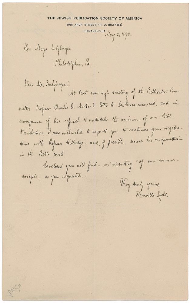 Zionist leader (1860–1945) who worked for the Jewish Publishing Society of America before she founded Hadassah in 1912. ALS, one page, 5.75 x 9.25, The Jewish Publication Society of America letterhead, May 2, 1898. Letter to Mayer Sulzberger, in full: "At last evening's meeting of the Publication Committee Professor Charles & Norton's letter to Dr. Gross was read, and in consequence of his refusal to undertake the revision of our Bible translation, I was instructed to request you to continue your negotiations with Professor Kittredge and, if possible, secure his co-operation in the Bible work. Enclosed you will find an 'inventory' of our manuscripts, as you requested." In fine condition, with intersecting folds. Sulzberger was an American judge and Jewish communal leader who was one of the founders of the Young Men's Hebrew Association; additionally he served as vice president of the Jewish Hospital of Philadelphia, and as chairman of the publication committee of the Jewish Publication Society of America.