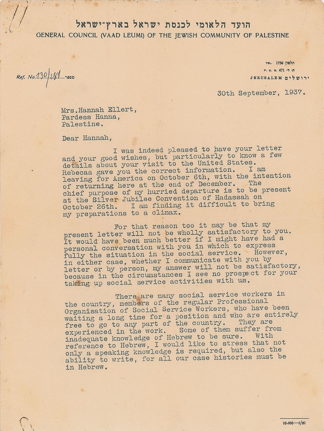 However, in either case, whether I communicate with you by letter or by person, my answer will not be satisfactory, because in the circumstances I see no prospect for your taking up social service activities with us. There are many social service workers in the country, members of the regular Professional Organisation of Social Service Workers, who have been waiting a long time for a position and who are entirely free to go to any part of the country. They are experienced in the work. Some of them suffer from inadequate knowledge of Hebrew to be sure. With reference to Hebrew, I would like to stress that not only a speaking knowledge is required, but also the ability to write, for all our case histories must be in Hebrew. As for specialization in the the work, such as the care of adolescents from 14- 17; alas, we have not yet reached such heights in the development of social services. Our family welfare workers must do all kinds of case work including that for children and adolescents.